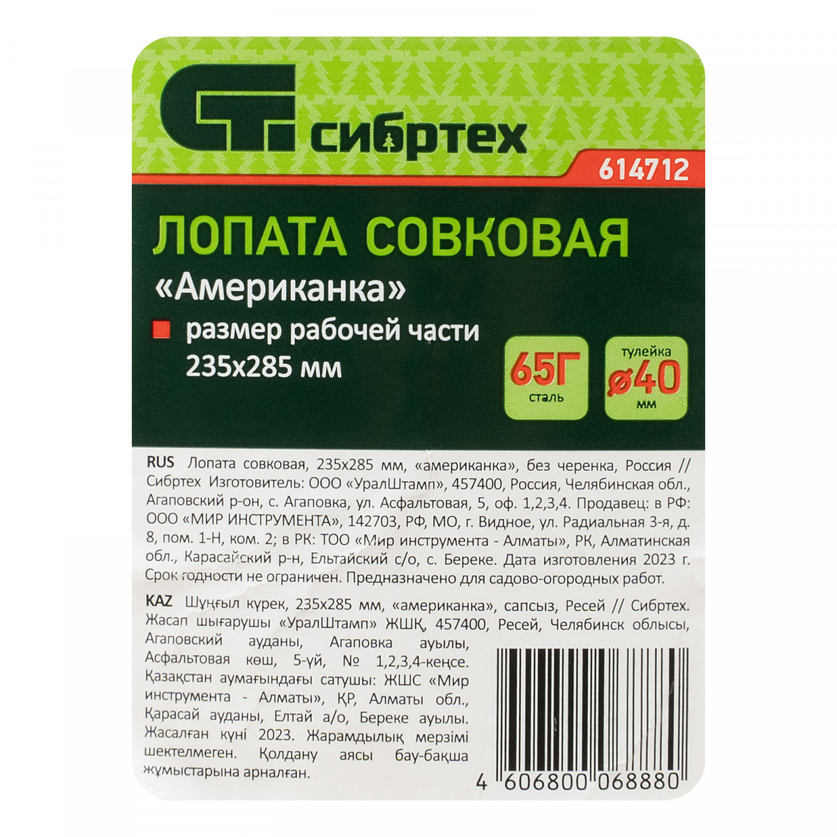 Лопата совковая, 220х285 мм, "американка", без черенка, Сибртех