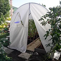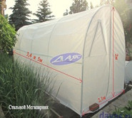 Высота - 210см, Ширина - 200см, Длина - 3,4м. 1) Материал чехла - Райфенхаузер SSS-100 (Ламинированный) 2) Каркас полностью стальной (круглая труба) 3) Торцы - с дверьми на молниях 4) Завязки внутри, прижимные ленты снаружи 6) Трегольные окна с торцов 7) Полная комплектация с инструкцией