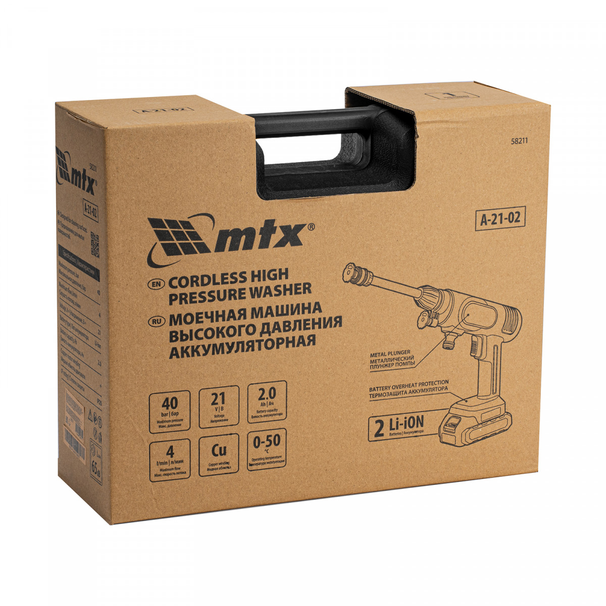 Моечная машина высокого давления аккумуляторная А-21-02, 40 бар, 4 л/мин, Li-ion 21 В, 2 акк.// MTX