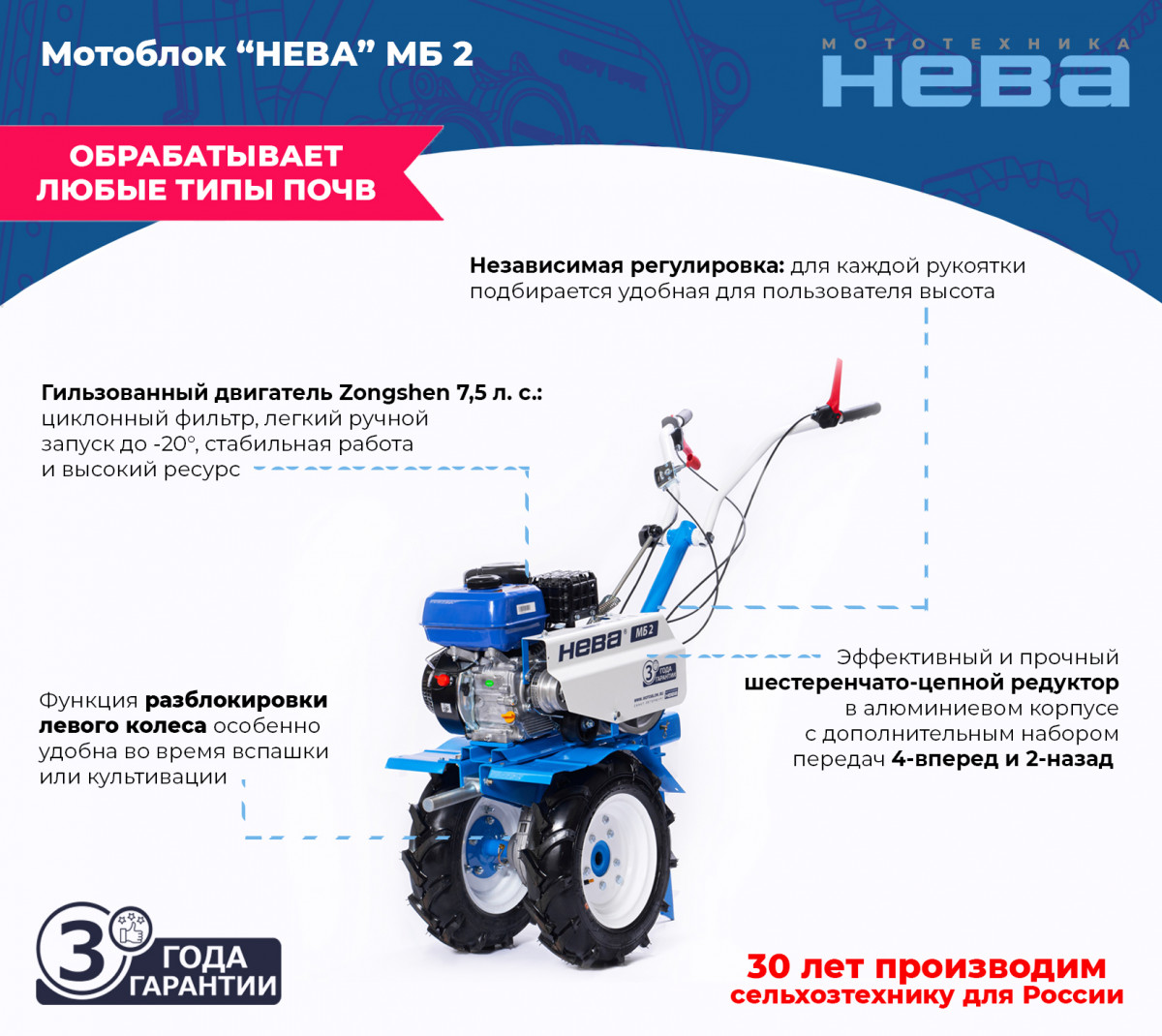 Мотоблок эффективно обрабатывает все виды почв, отлично тянет загруженную телегу по грунтовой и заснеженной дороге. Также эта модель используется для кошения травы, уборки снега и опавшей листвы. Мотоблок «НЕВА» МБ2-ZS (GB225) сочетает в себе надежность, функциональность и практичность.