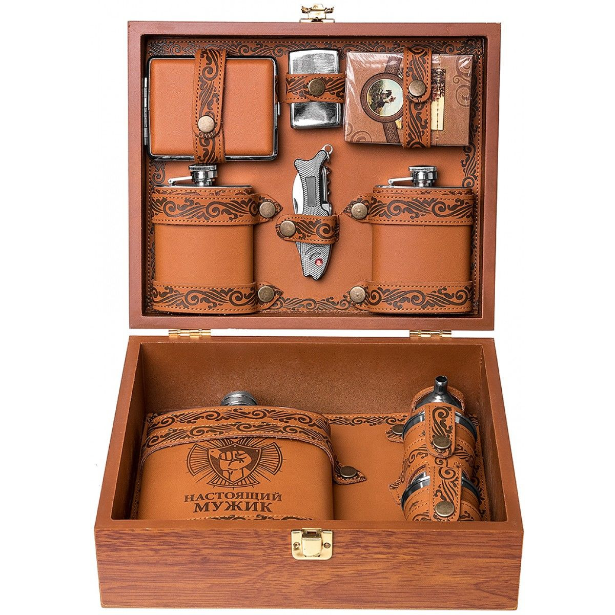 В набор входит: Фляжка большая, Фляжка малая 2 шт, Зажигалка, Стопки 2 шт, Портсигар, Нож-складной, Карты игральные, Воронка.