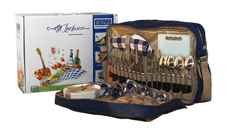 Все включено - название говорит само за себя.В состав набора включено все, что может понадобиться большой компании для полноценного отдыха на природе.Материал: Полиэстер.Вес (кг): 5.Размер (ДхШхВ), см: 50х28х37.Страна-производитель: Китай.Цвет: Синий.Количество персон: 6.Изотермическое отделение для продуктов: есть.Гарантия (лет): 1.В комплекте: 6 пивных бокалов, 6 стопок, 6 ложек, 6 вилок, 6 ножей, 6 тарелок, 6 пиалок, нож для сыра, открывалка, набор для соли и перца, разделочная доска, 6 салфеток,Материал вилок и ножей корозийно-стойкая сталь, материал посуды - пластик бытового назначения.
