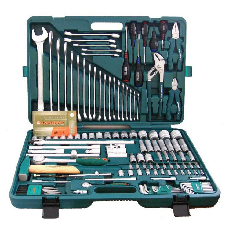 Состав1/4"DR: Головки 4-13 мм, Головки удлиненные 7, 8, 10, 12, 13 мм, Трещотка, Вороток, Удлинители шарообразные 50, 75 мм, Удлинитель гибкий 145 мм, Кардан, Головки биты Torx T10-T27, Hex 4-10 мм, 1/2"DR: Головки 8-32 мм, Головки глубокие 10-19 мм, Трещотка, Вороток, Удлинители 150 и 250 мм, Шарнирная рукоятка 375 мм, Вороток Г-образный 250 мм, Удлинитель шарообразный 150 мм, Кардан, Свечные головки магнитные 16 и 21 мм, Головки-биты Hex 12, 14, 17 мм, Комбинированные ключи 6-32 мм, Ключи разрезные 8х10, 9х11, 12х13, 14х17, 17х19 мм, Угловые ключи шестигранные, Угловые ключи Тorx, Трубный захват 250 мм, Набор выколоток кернов и зубил, Бокорезы 6", Пассатижи 7", Магнитная рукоятка телескопическая, Молоток 500 гр., Отвертки SL 6.5х38, 6х100, 5х75, PH# 2х38, 2х100, 1х175.