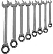 Гаечный комбинированный ключ представляет собой конструкцию, объединяющую рожковый профиль и накидной профиль с рабочей частью со встроенным храповым механизмом. Сочетание двух одноразмерных профилей компенсируют недостатки каждого в отдельности. Храповой механизм с колесом в 72 зуба обеспечивает высокий передаваемый крутящий момент благодаря применяемой хромованадиевой стали, закаленной особым способом. Малый, 5°, обратный ход делает ключ незаменимым в ограниченном рабочем пространстве. Ключ изготовлен по стандарту ANSI, имеет трехслойное хромоникелевое покрытие, зеркально отполирован. Применяется при обслуживании крепежа при свободном вращении.