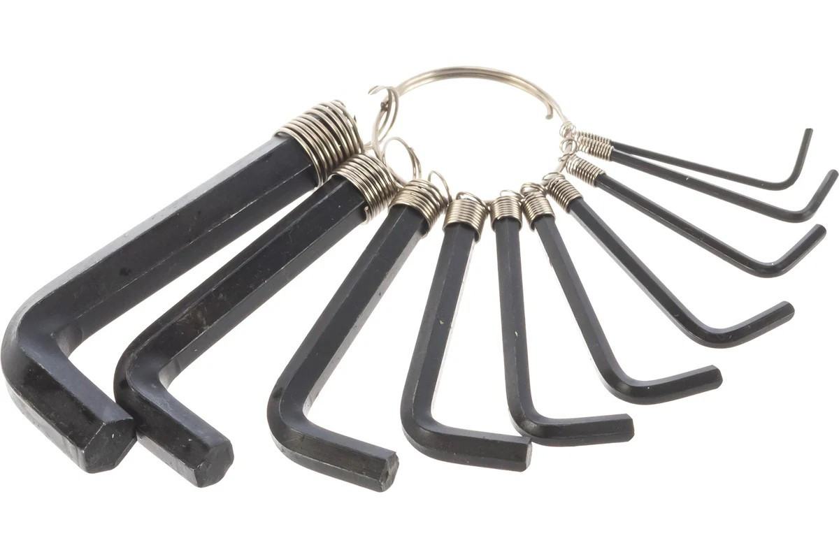 Набор имбусовых ключей на кольце 10шт.- это комплект шестигранных г-образных ключей, который предназначен для работы с крепежом, оснащенным внутренним шестигранным профилем.
