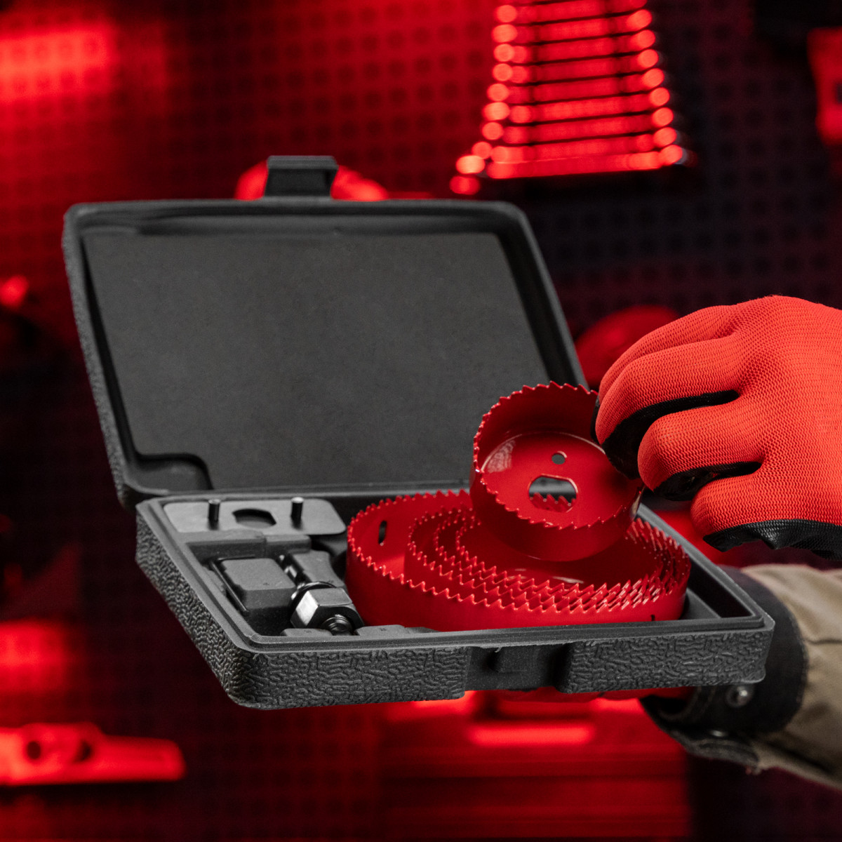 Набор кольцевых пил по дереву Matrix 704715 состоит из 8 предметов и включает 5 коронок диаметром 64-127 мм. Они предназначены для вырезания круглых отверстий глубиной до 27 мм в дереве, фанере, ДСП, ДВП, а также гипсокартоне и пластике. Пилы устанавливаются на электродрель. В комплект поставки входит проставка для защиты коронки от проворота, что повышает скорость и качество сверления. Набор будет полезен при установке выключателей, электророзеток и элементов освещения, а также при прокладке трубопроводов.