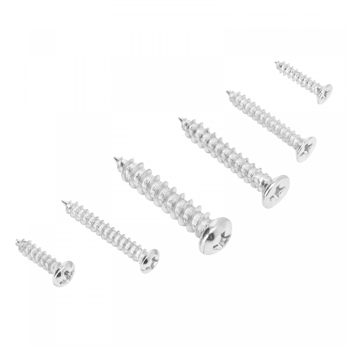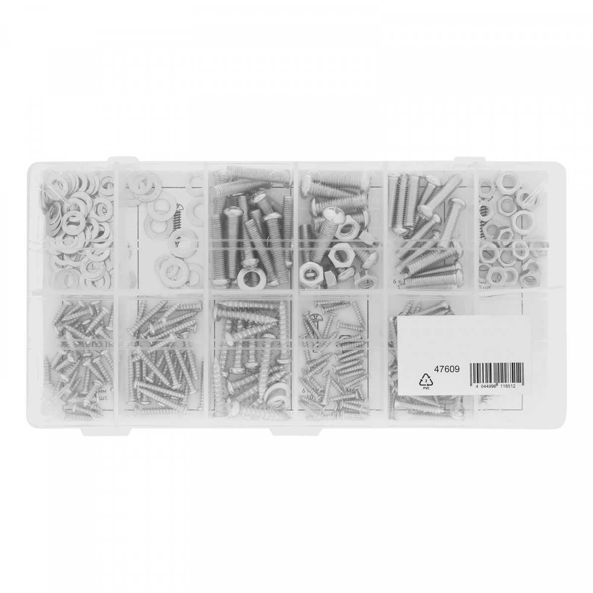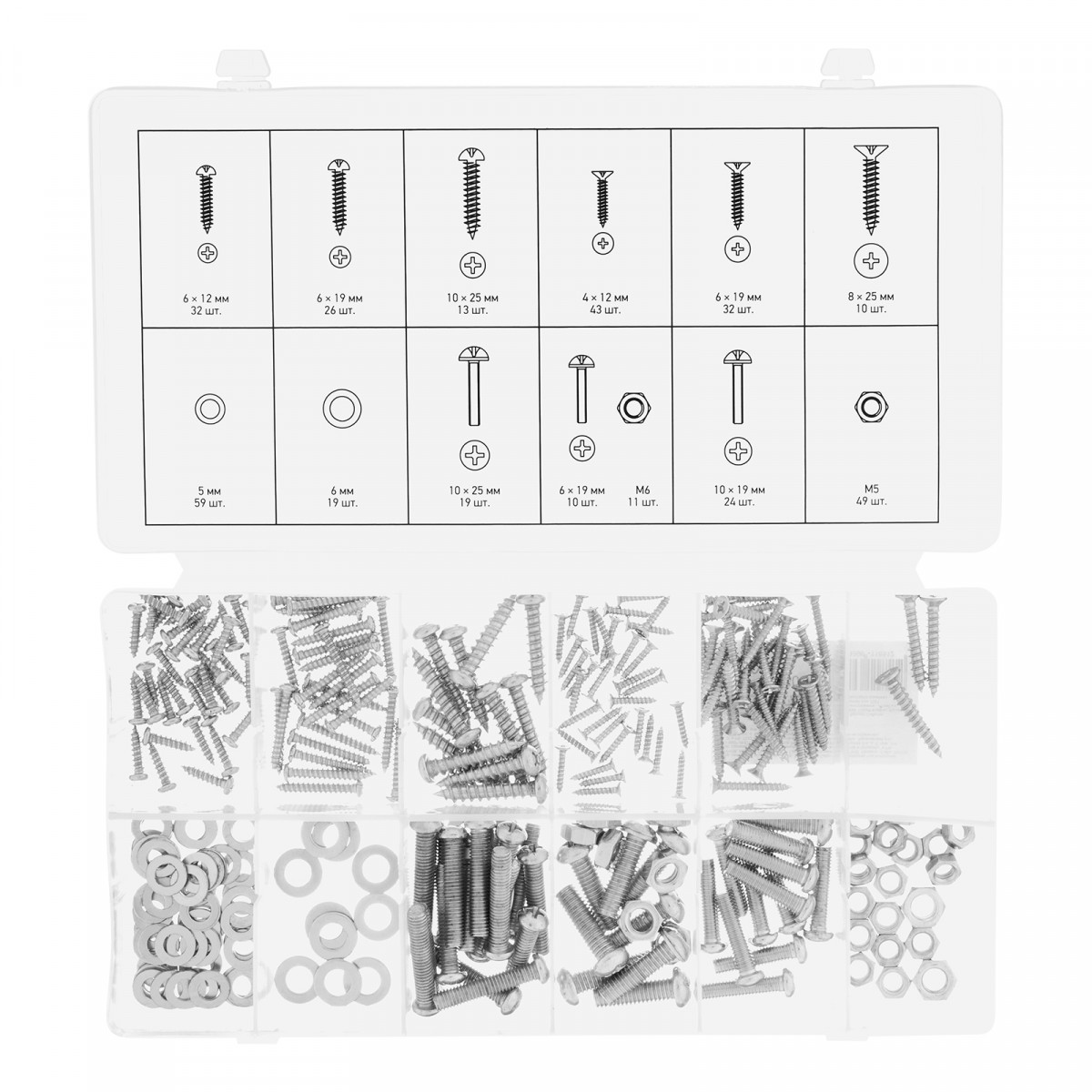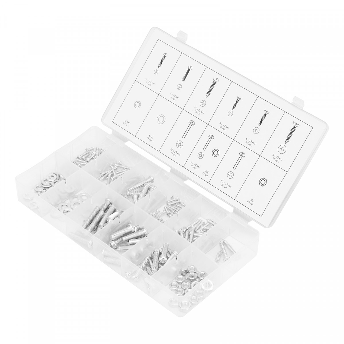 Пластиковый кейс - 1 штСаморезы по дереву: 4х12 мм - 43 шт6х19 мм - 32 шт8х25 мм - 10 штСаморезы по металлу: 6х12 мм - 32 шт6х19 мм - 26 шт10х25 мм - 13 штВинты: 6х19 мм - 10 шт10х19 мм - 24 шт10х25 мм - 19 штШайбы: 5 мм - 59 шт6