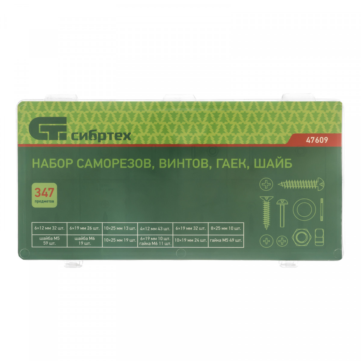 Набор Сибртех 47609 состоит из 347 предметов и включает саморезы с диаметром резьбы от 4 до 8 мм и длиной от 12 до 25 мм, а также гайки М5-М6, шайбы 5 и 6 мм и винты 10 х 25 мм, 6 х 19 мм, 10 х 19 мм. Крепежные элементы предназначены для создания надежных резьбовых соединений и используются для сборки мебели, техники, монтажа оборудования, проведения сантехнических работ, а также в автомобилестроении. Также будут полезны дома или на даче.