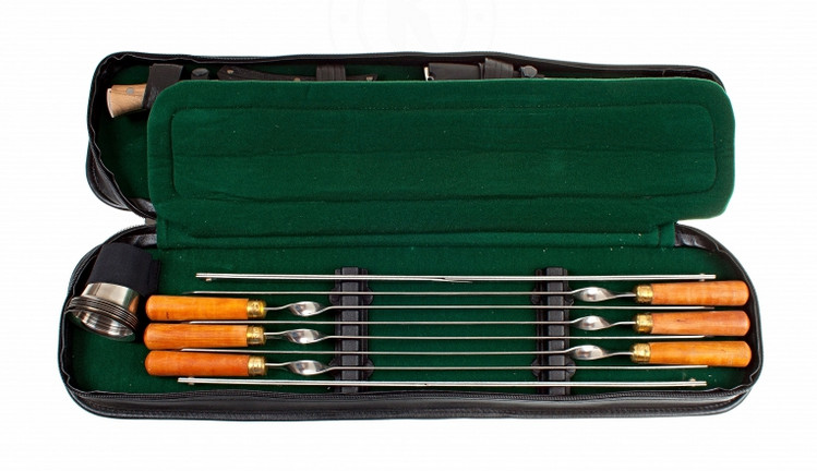 Шампур: 6 шт.Нож хозяйственно-бытовой «Р-2»: 1шт.Вилка для снятия мяса с шампура: 1шт.Мангал складной (комплект, нерж. сталь): 1шт.Нож «Вепрь» (без ножен): 1шт.Футляр (искусственная кожа или нейлон): 1шт.Нож разделочный (туристический): 1шт.Стаканчики (нержавеющая сталь): 6 шт.