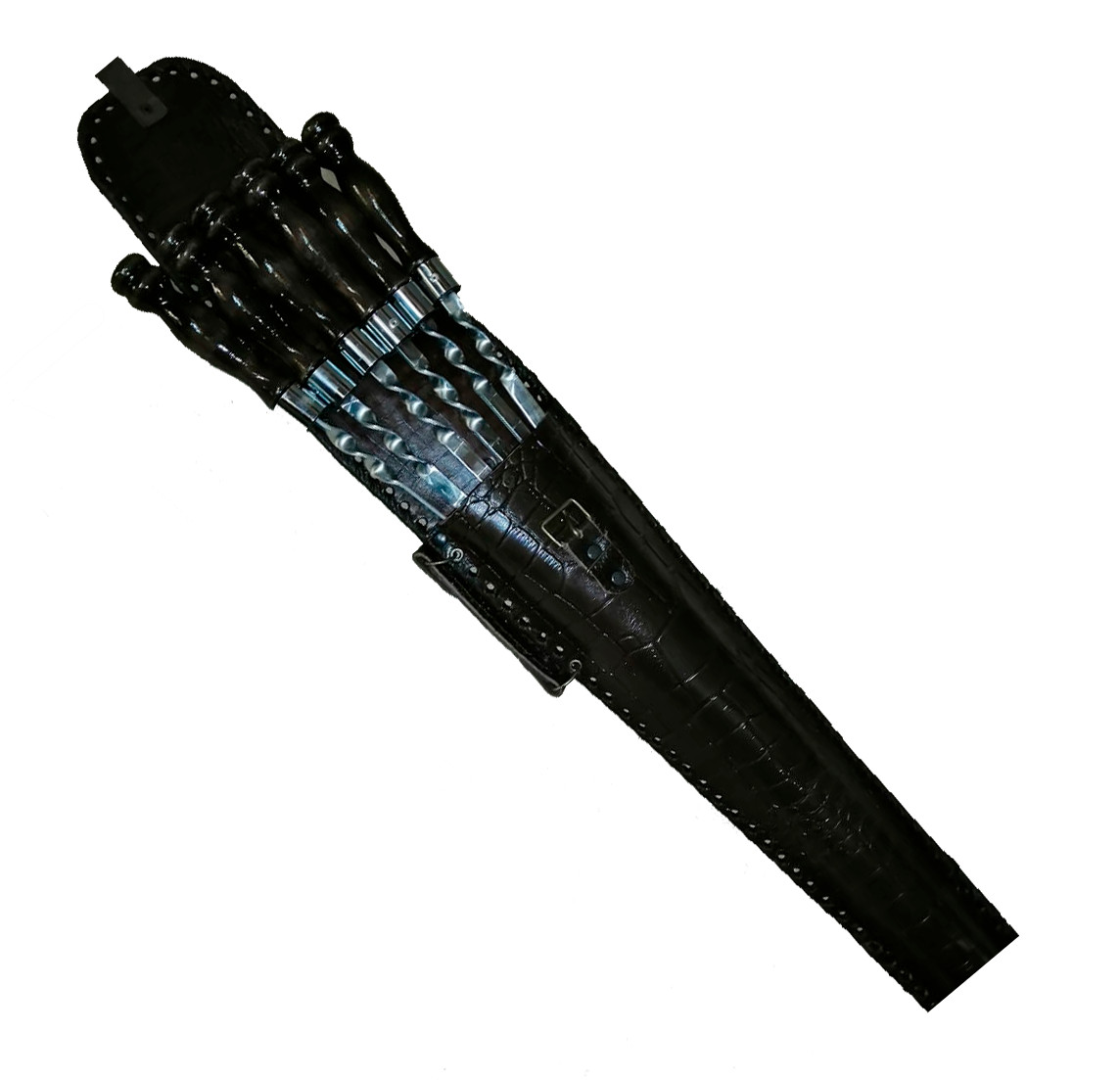 Шампура из нержавеющей стали толщиной 3 мм. - 6 шт. Рабочая длинна шампура 400 мм - внимание! Это длинна только лезвия. Шампура из стали 3 мм. удобны для больших кусков мяса, за счет толщины шампур не гнётся, а нагревшись начинает нагревать мясо внутри. Деревянная ручка покрыта лаком, на ручке изготовлено огнеупорное кольцо для защиты от нагрева. Таганок из нержавеющей стали 3 мм. Чехол из натуральной кожи.