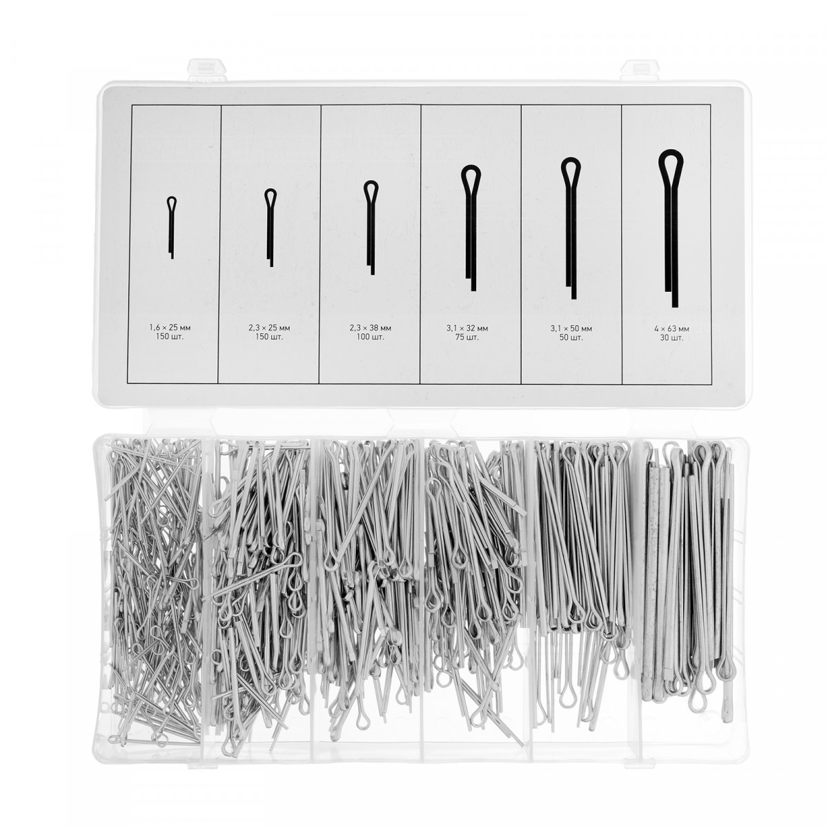 Набор шплинтов, S головки х L: 1.6 х 25.2, 3 х 25.2, 3 х 38, 3, 1 х 32, 3, 1 х 50.4 х 63 мм, 555 предметов Сибртех