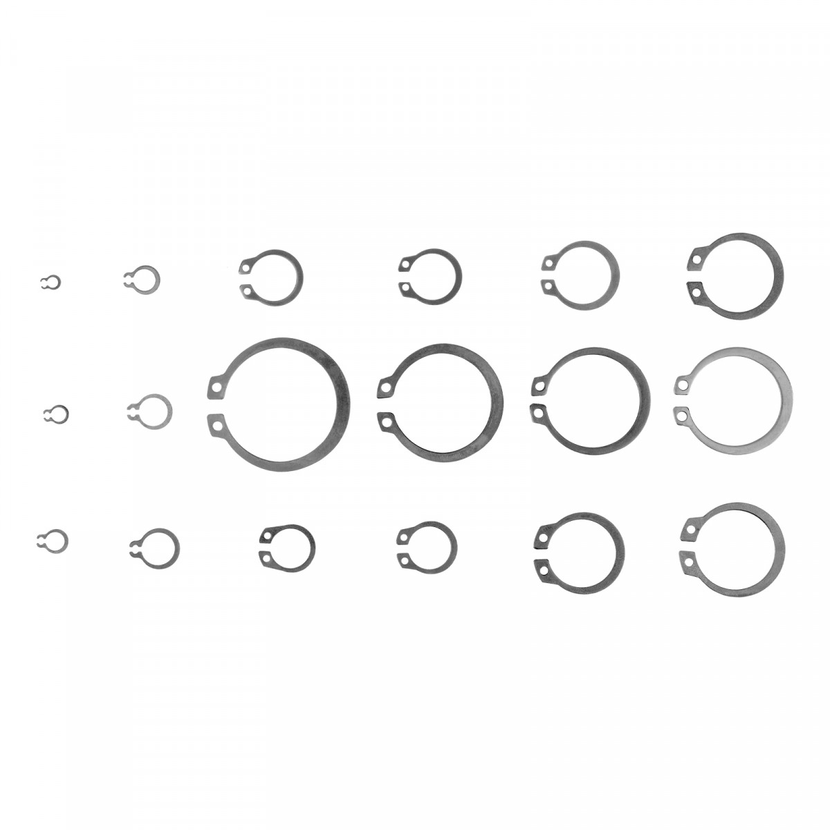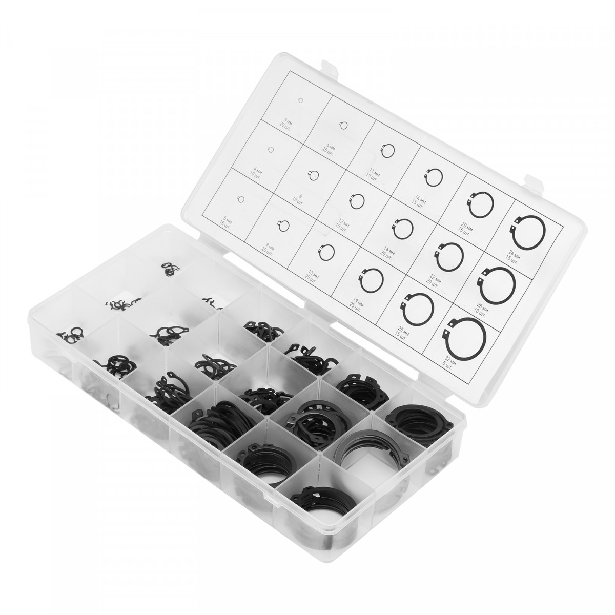 Пластиковый кейс- 1 штСтопорные кольца: 3 мм - 20 шт4 мм - 10 шт5 мм - 15 шт6 мм - 25 шт8 мм - 15 шт9 мм - 20 шт11 мм - 15 шт12 мм - 15 шт13 мм - 25 шт14 мм - 15 шт16 мм - 20 шт19 мм - 25 шт20 мм - 15 шт22 мм - 20 шт25