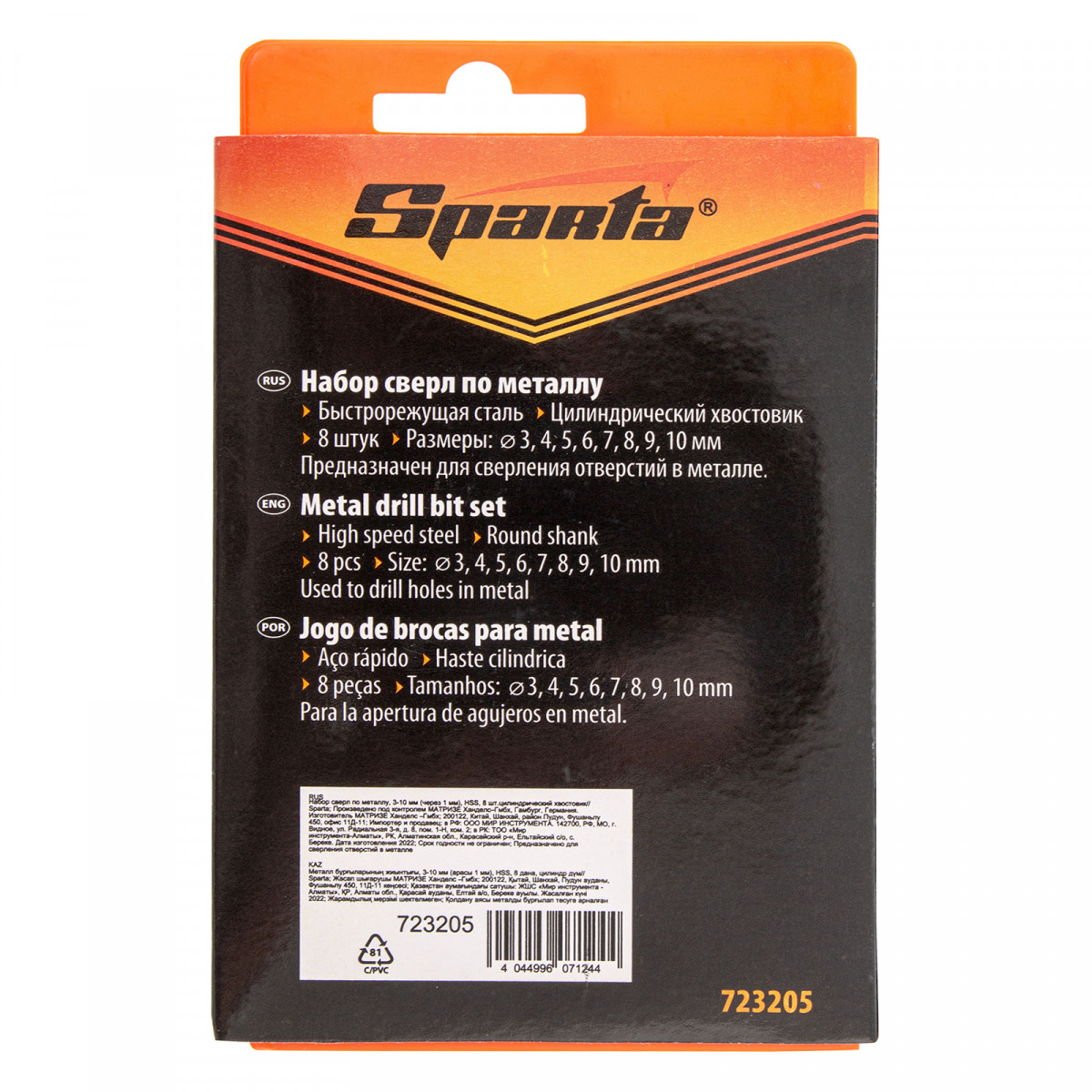 Набор Sparta 723205 включает 8 сверл по металлу диаметром от 3 до 10 мм (через 1 мм), из стали HSS, с цилиндрическим хвостовиком. Они предназначены для сверления отверстий в металлических заготовках. В комплекте сверла самых ходовых размеров, которые будут полезны дома, на даче или в гараже.