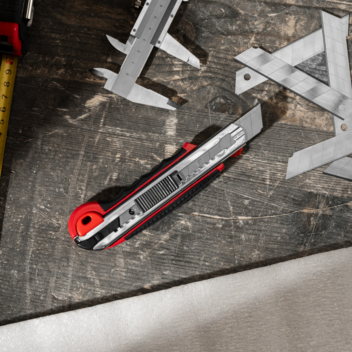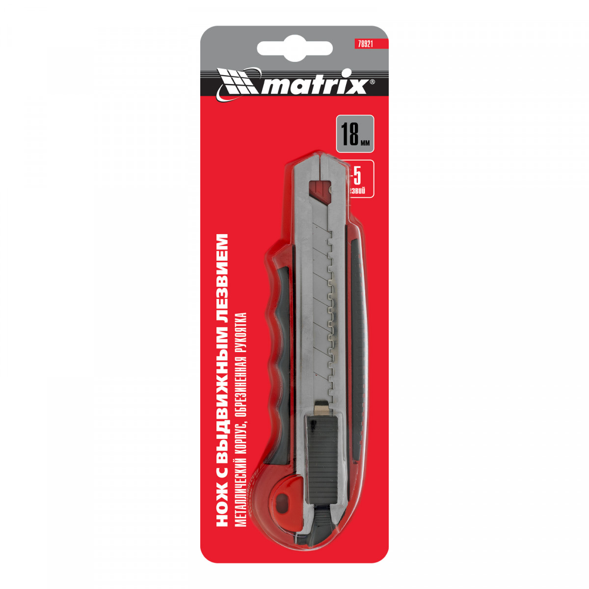 Нож, 18 мм, выдвижное лезвие, металлическая направляющая, обрезиненная ручка, 5 лезвий Matrix