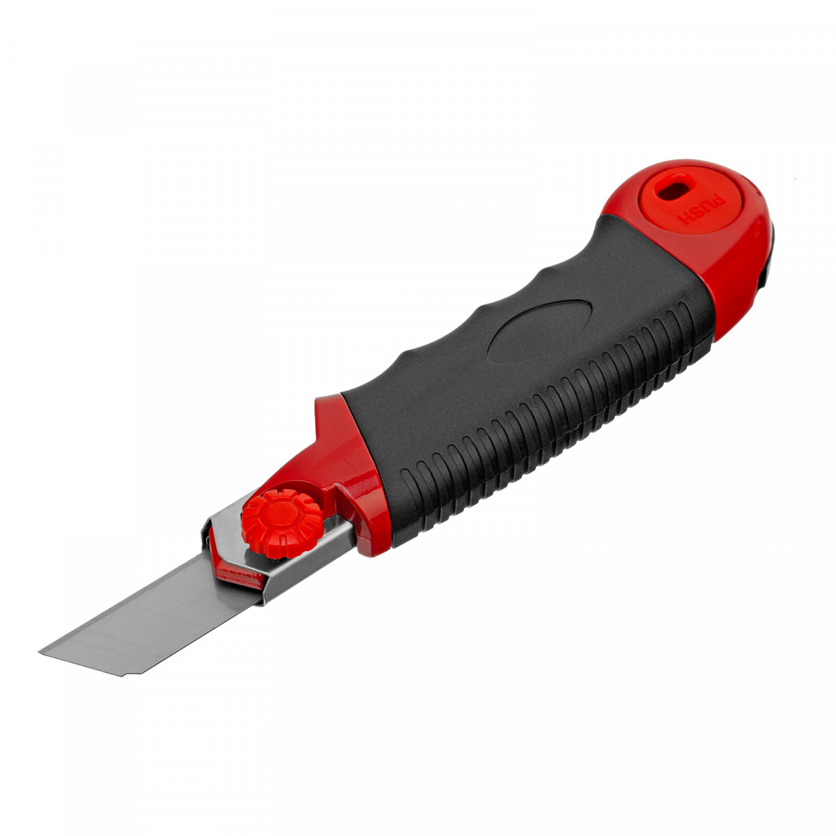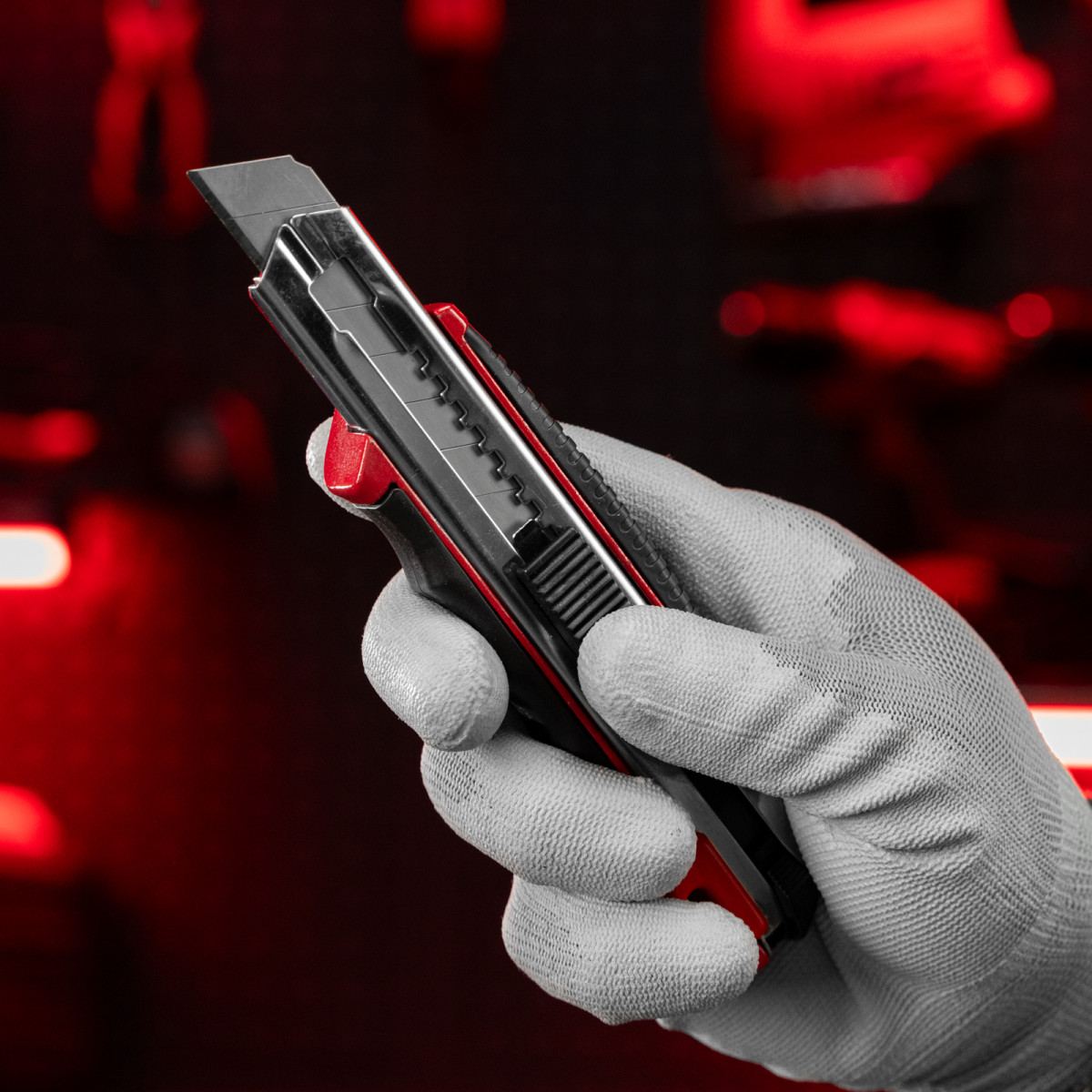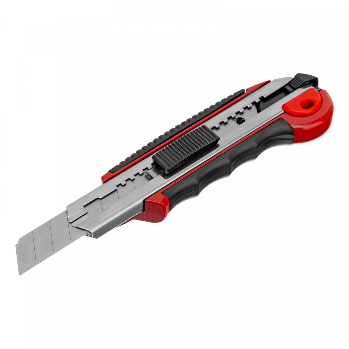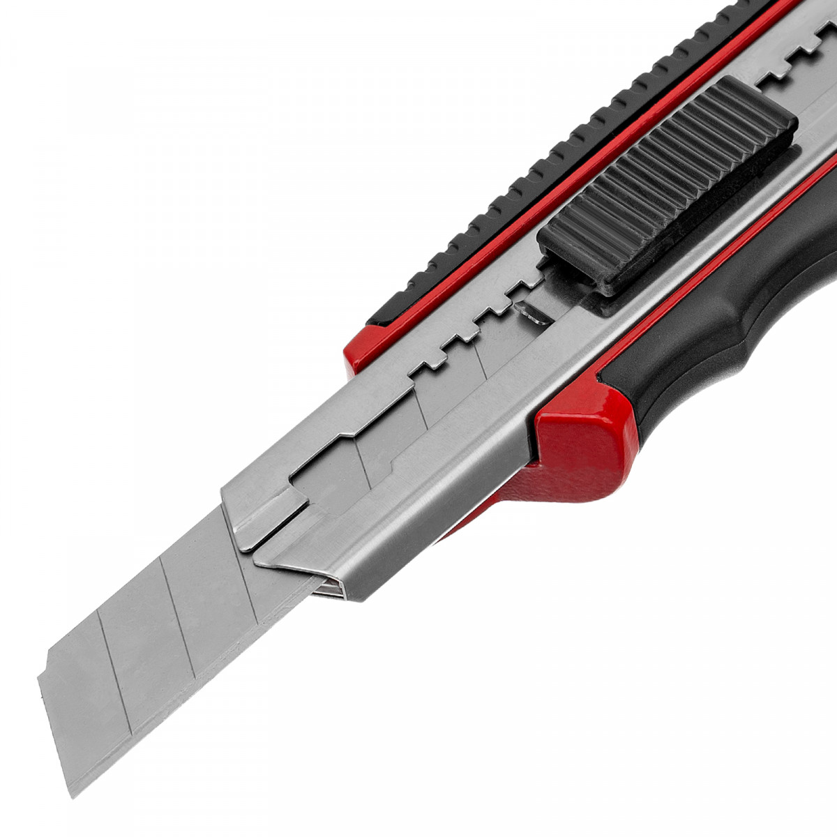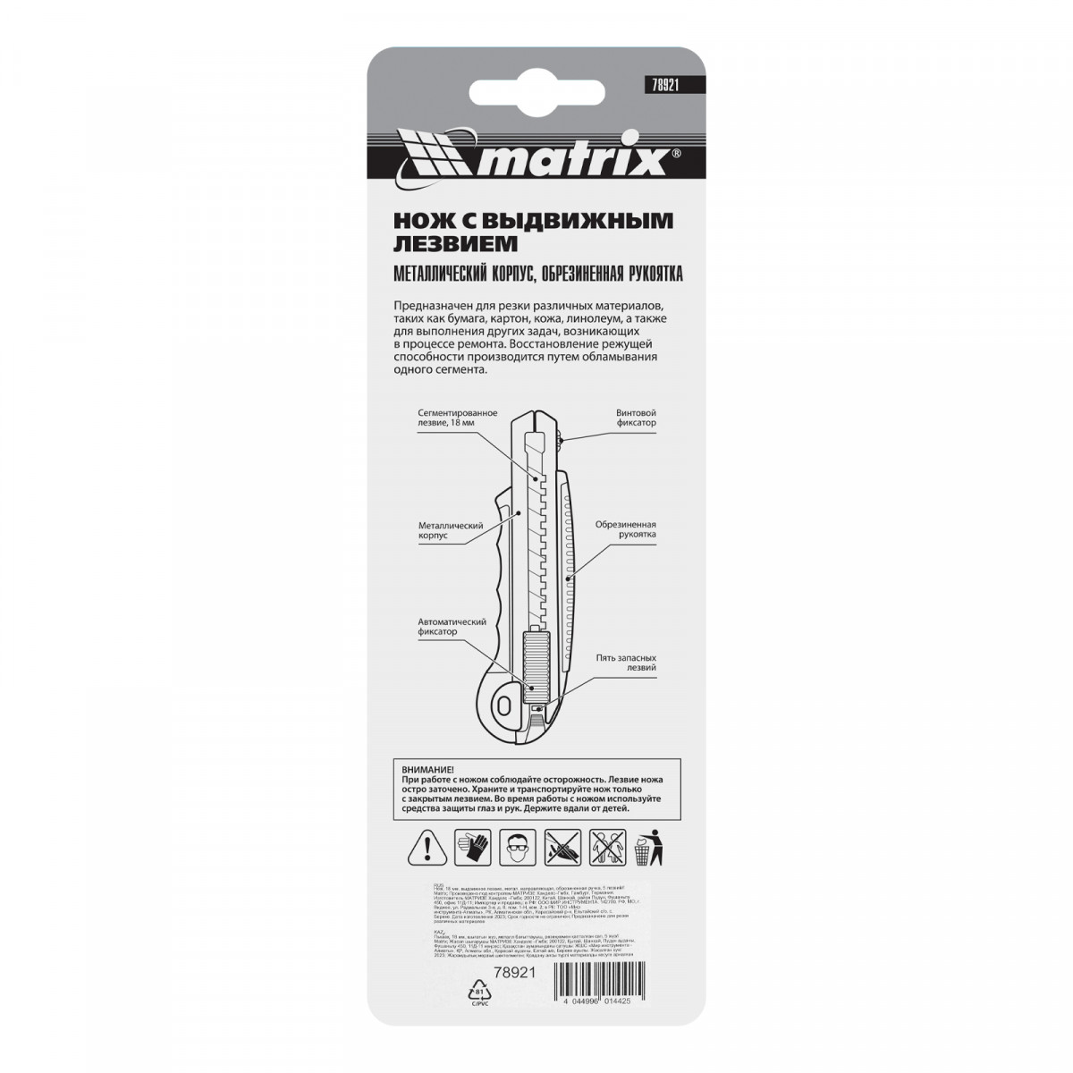 Нож Matrix 78921 с выдвижным лезвием шириной 18 мм, металлической направляющей, обрезиненной ручкой и 5 лезвиями в комплекте, используется для резки отделочных материалов (обоев, линолеума), а также картона, бумаги, пленки, скотча. Выдвижное полотно закрепляется в рабочем положении автоматически, а металлическая направляющая придает прочность конструкции и обеспечивает долговечность инструмента. Предусмотрена возможность замены лезвий. Нож подходит как для бытового, так и для профессионального применения.