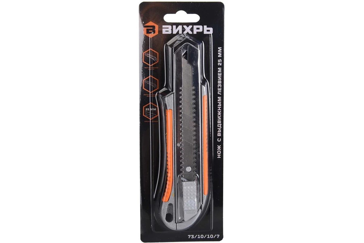 Нож с выдвижным лезвием 25 мм, металлический корпус, автоматический фиксатор, Вихрь предназначен для резки различных материалов в бытовых, хозяйственных или строительных целях.