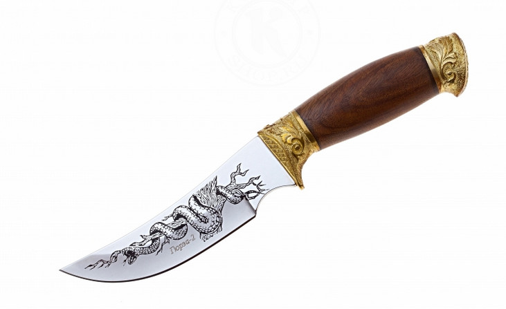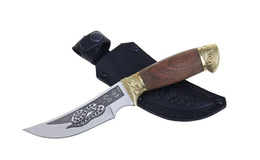 Разделочный нож специального назначения «Гюрза-2» — функциональный, надёжный и удобный режущий инструмент — верный спутник охотника, рыбака или туриста. Качественный нож в походе и на охоте выполняет множество задач, а порою помогает сохранить жизнь. Его характеристики: полная длина — 240 мм; длина клинка — 120 мм; толщина клинка — 3,7 мм; заточка — вогнутая; поясные ножны из натуральной кожи; форма клинка — изогнутая, верхний край клинка возвышается к острию; материал клинка — коррозионностойкая сталь; рукоятка — кавказский орех, латунь; конструкция — всадной монтаж, гарда из латуни/мельхиора. Рисунок на клинке ножа выполнен вручную, методом двойного травления, что позволяет придать ему большую глубину и фактурность. Гарда и навершие ножа выполнены из латуни с тисненым рисунком.