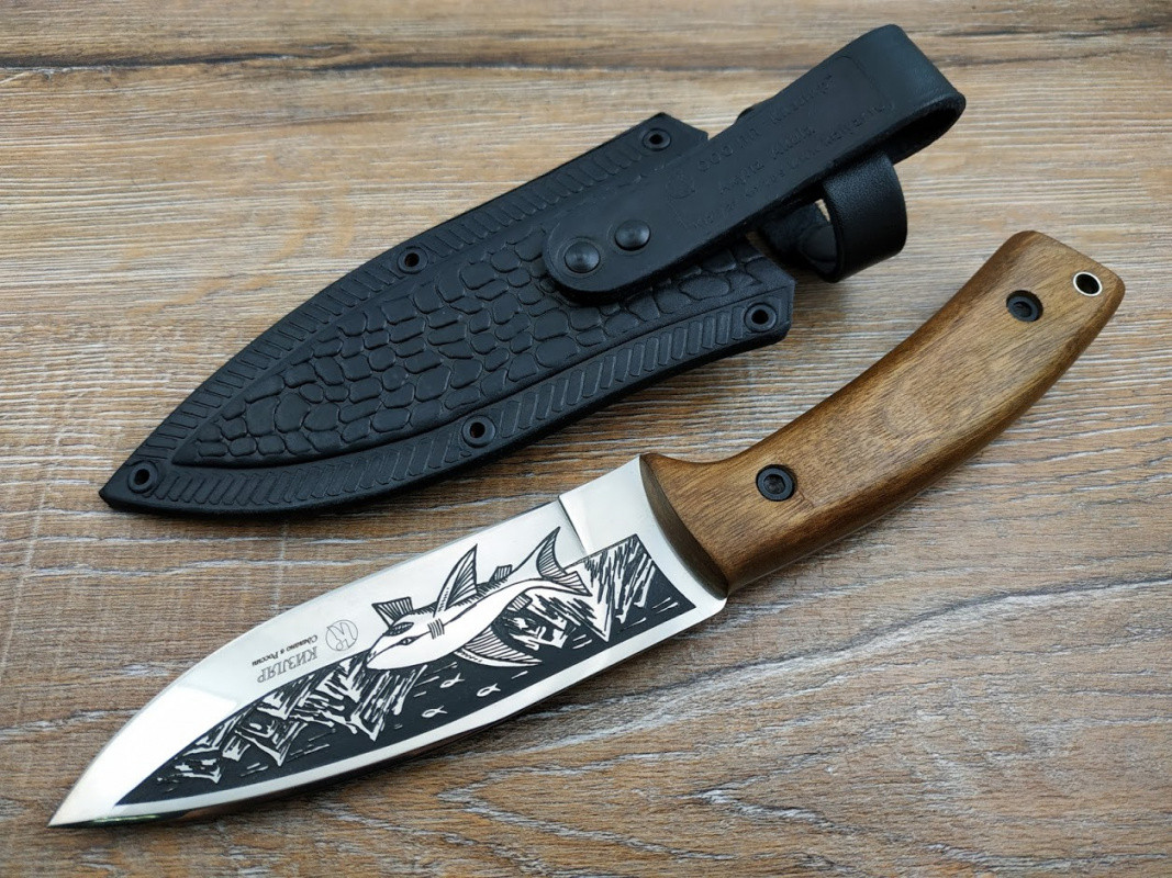 Нож является одним из самых важных инструментов как в походе, так и на охоте или рыбалке. С его помощью возможно не только моментально вскрыть консервную банку, но и разрезать веревку или прорубить тропинку в зарослях. Помимо этого, ножи могут быть использованы в ряде других сфер, например спорт или кулинария. Также не каждый нож требует наличия лицензии. Туристические ножи, например, не относятся к холодному оружию, из-за чего их может приобрести любой желающий. Производственное предприятие ООО ПП «Кизляр» занимается выпуском высококачественных ножей начиная с конца 90х годов. Огромный ассортимент компании, который создается по современным стандартам мастерами своего дела, порадует своим разнообразием. Весь товар этого производителя проходит полевые испытания перед тем как оказаться на складах и полках магазинов. Представленная модель угловатого ножа с особым художественным оформлением "Акула-2" отлично справится со всеми своими задачами, которые могут пасть на неё во время обычного использования. Лезвие изготовлено из AUS-8. Рукоятка сделана из дерева ореха. Общая длина модели равна 260 мм. Длина клинка равна 135 мм, толщина 2,4 мм. Твердость находится на уровне 57-59 HRC. ОБРАЩАЕМ ВАШЕ ВНИМАНИЕ: Данная модель не является холодным оружием.