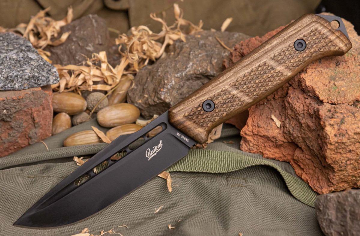 Рукоять выполнена из натуральной древесины. Дерево является одним из самых традиционных и распространенных материалов для рукоятей ножей. Основным плюсом древесины является то, что, благодаря своей текстуре, она позволяет без особых усилий практически любую художественную форму рукояти. Традиционно используется на охотничьих ножах.