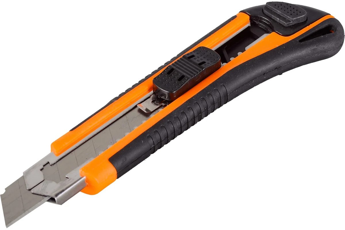 Нож с выдвижным лезвием 18 мм, двухкомпонентный корпус, металлическая направляющая, автоматический фиксатор, Вихрь предназначен для резки различных материалов в бытовых, хозяйственных или строительных целях. Нож имеет выдвижные, сегментированные сменные лезвия, которые можно отламывать по мере износа режущей части.Нож Вихрь имеет двухкомпонентный корпус, автоматический фиксатор лезвия и оснащен металлической направляющей лезвия, что повышает прочность ножа при давлении на него во время резки.*.