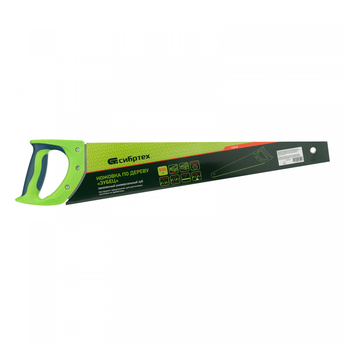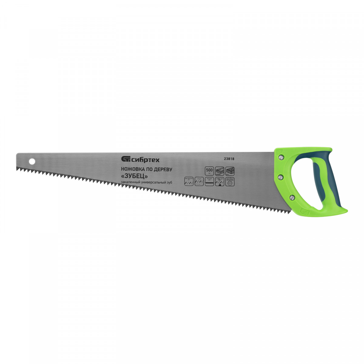 Ножовка по дереву Сибртех «Зубец» 23818 с полотном длиной 500 м, с калеными зубьями с шагом 7 мм и 2D-заточкой, с двухкомпонентной рукояткой, используется для продольного и поперечного пиления древесины и ДСП. Рабочая кромка с шагом зубьев 7 мм обеспечивает быстрый двусторонний рез. Возможна заточка режущей части при необходимости. Ножовка применяется для выполнения плотницких работ, пригодится также и в быту.