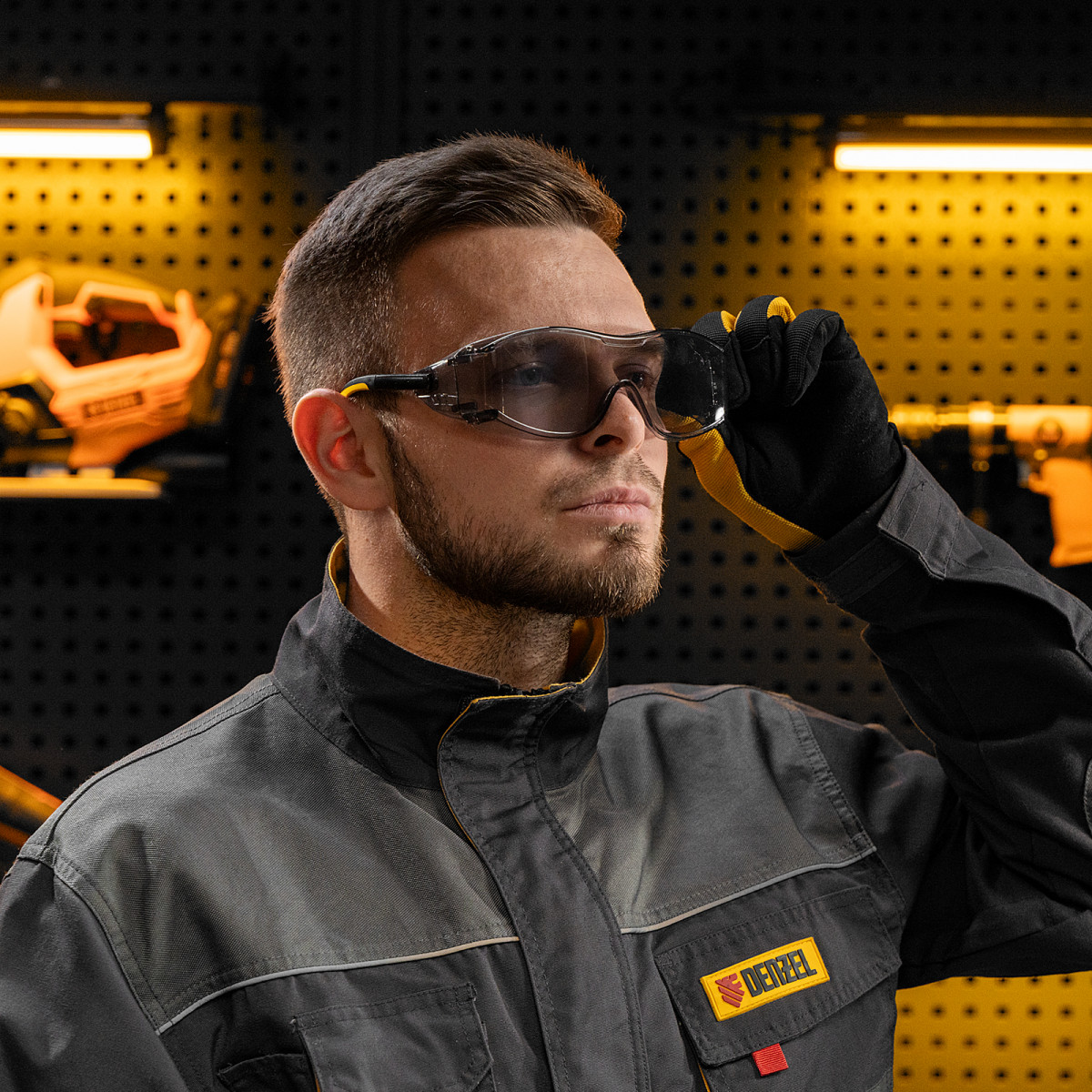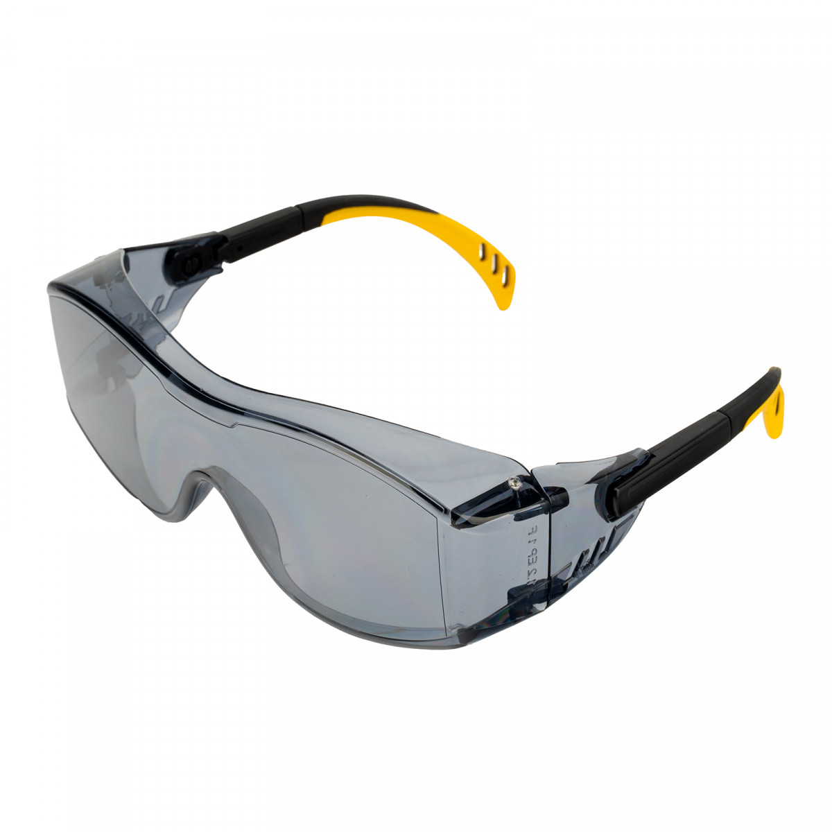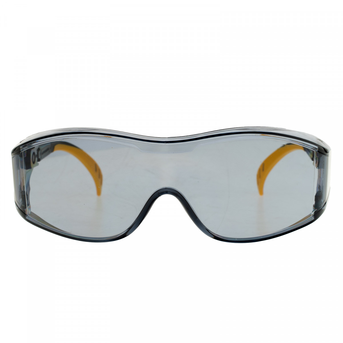 - Продуманная конструкция — особая форма линз обеспечивает боковую и надбровную защиту, а также позволяет носить защитные очки вместе с коррригирующими.
