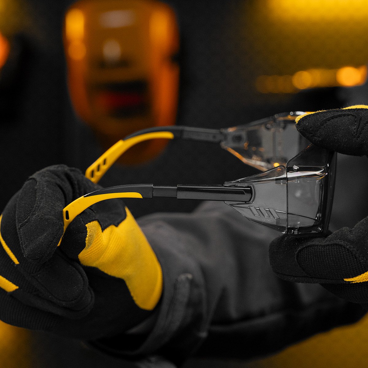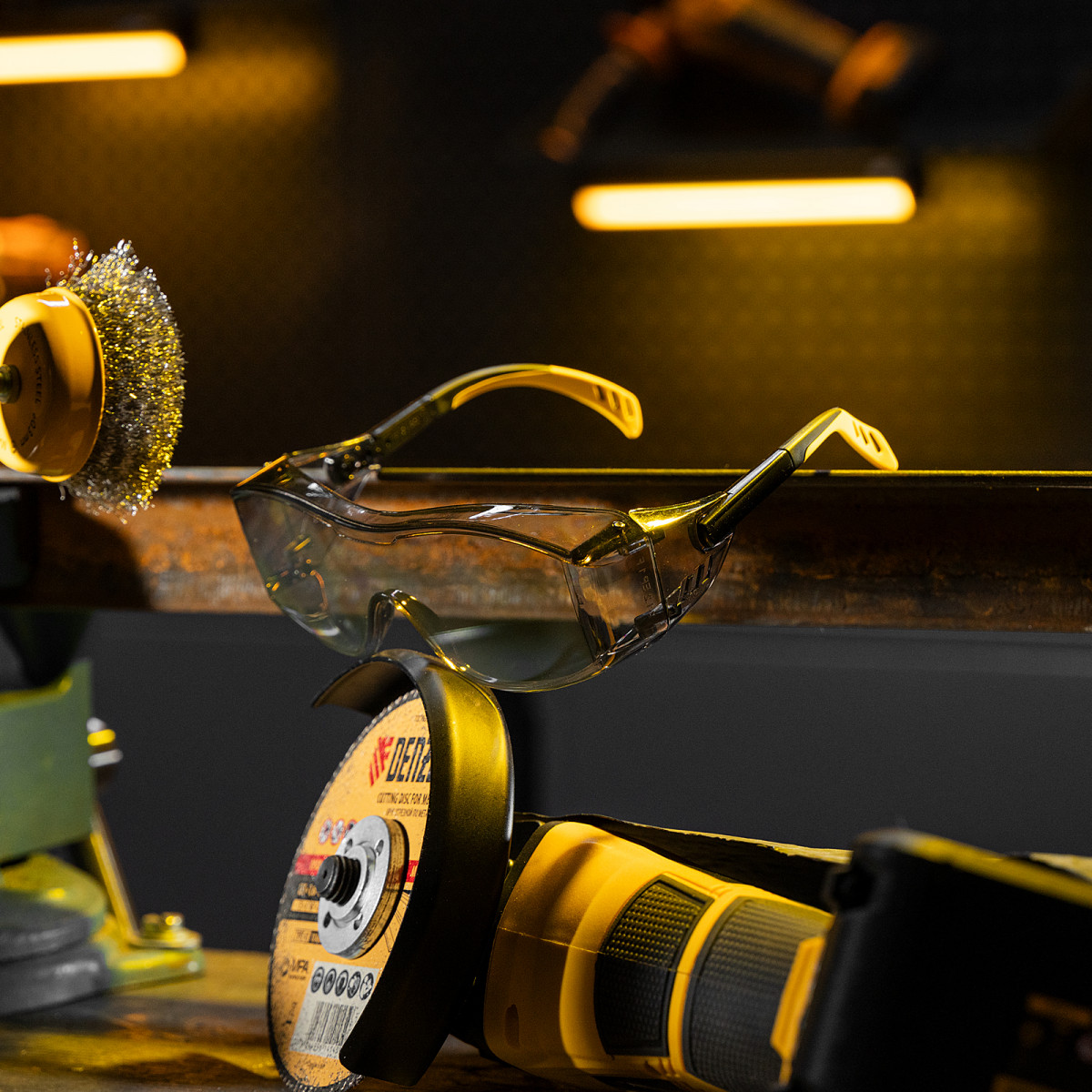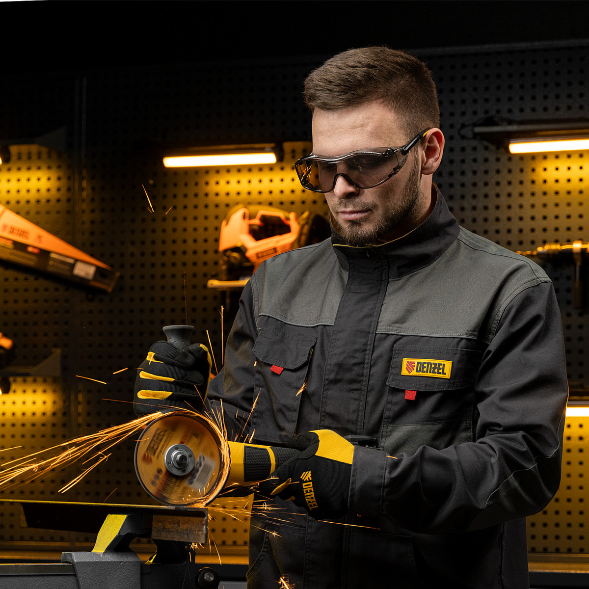 - Продуманная конструкция — особая форма линз обеспечивает боковую и надбровную защиту, а также позволяет носить защитные очки вместе с коррригирующими.
