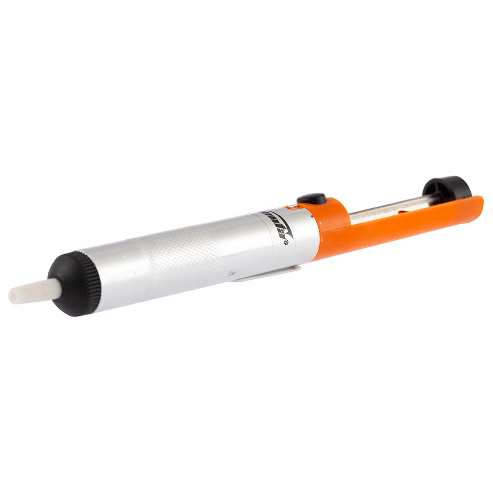 Паяльный металлический оловоотсос Sparta предназначен для удаления остатков припоя с печатных плат. Принцип работы такой же, как у медицинского шприца: сначала нужно надавить на поршень до упора, а затем возвращать назад, затягивая припой. Помповые оловоотсосы считаются самыми простыми и удобными в использовании приспособлениями для удаления припоя. Перед применением такого прибора по назначению припой нужно хорошо разогреть, это облегчит его всасывание. Оловоотсос Sparta выполнен из металла, имеет удобную конструкцию и яркую оранжевую рукоять, благодаря чему хорошо заметен в ящике для инструментов. Приспособление поставляется в блистере (пластиковой упаковке на картонной основе) со схематической инструкцией по использованию.