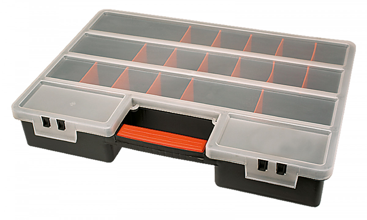 Органайзер TOPEX размером 46 x 33 x 8 см. Большой, удобный органайзер с регулируемыми перегородками для изменения размера отделений в зависимости от потребностей.