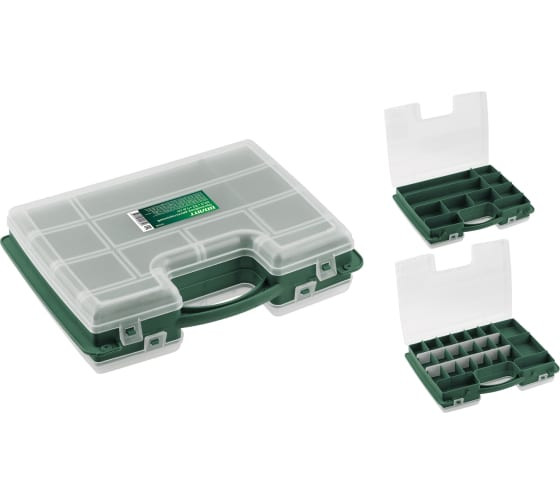 Двухсторонний органайзер ВОЛАТ 295x220x76 мм 20250 выполнен в форме кейса, имеет переставные перегородки, на одной стороне 22 отделения, на другой - 10 отделений. Служит для хранения и переноски крепежных и других мелких изделий. В органайзере удобно размещаются необходимые аксессуары и различные мелочи. Прозрачная крышка позволяет видеть расположение крепежа внутри.