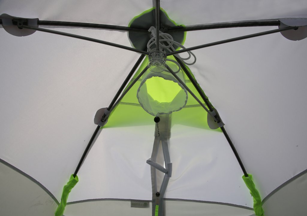 Конструкция стеклокомпозитного каркаса «Лотос» защищена патентом №171472.Стеклокомпозитные ребра защищены напрессованными на них металлическими насадками в виде трубок для надежной фиксации ребер в шарнирных узлах дуг каркаса. Фиксирующие шарнирные элементы (скобы и хомуты) изготовлены из стали толщиной 1,5 мм. Оси шарнирных узлов выполнены из цельных стальных заклепок диаметром 3,0 мм.Механизм раскрытия каркаса ЛОТОС 2С выполнен из прочного морозостойкого поликарбоната (применяется механизм 5Х, используемый в базовой версии ЛОТОС 2).Тент палатки изготовлен из современных высокотехнологичных тканей с водонепроницаемым покрытием, обеспечивающих надежную защиту от атмосферных осадков, сильного ветра и мороза.Отличительные особенности алюминиевого и стеклокомпозитного каркасов «Лотос»: