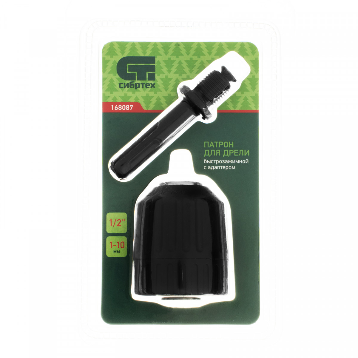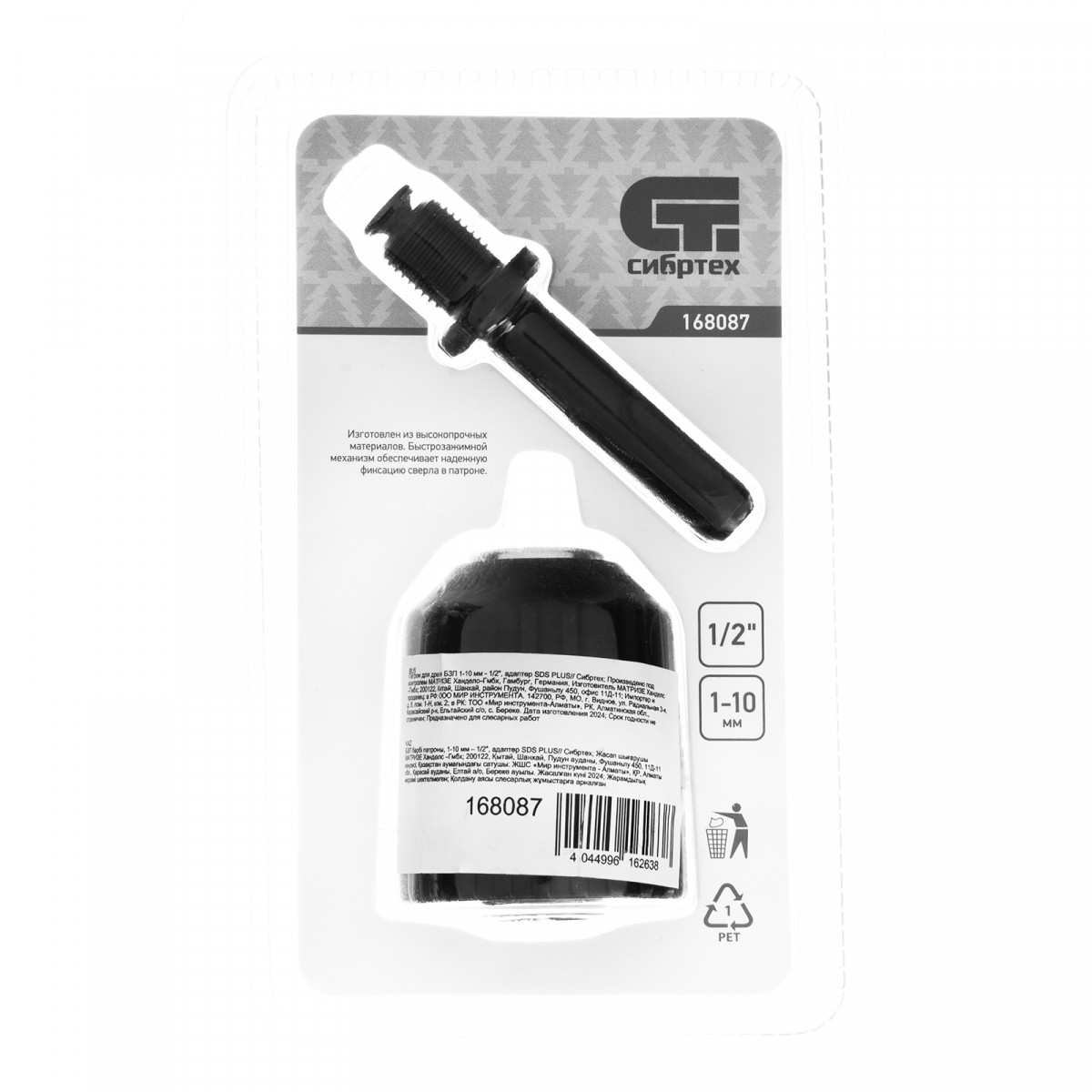 Патрон Сибртех БЗП 168087, тип соединения 1/2 дюйма, под сверла 1-10 мм, с адаптером SDS PLUS в комплекте, предназначен для использования с дрелью. Он надежно фиксирует оснастку, что обеспечивает комфортную работу. А благодаря переходнику SDS PLUS возможна работа с перфоратором.