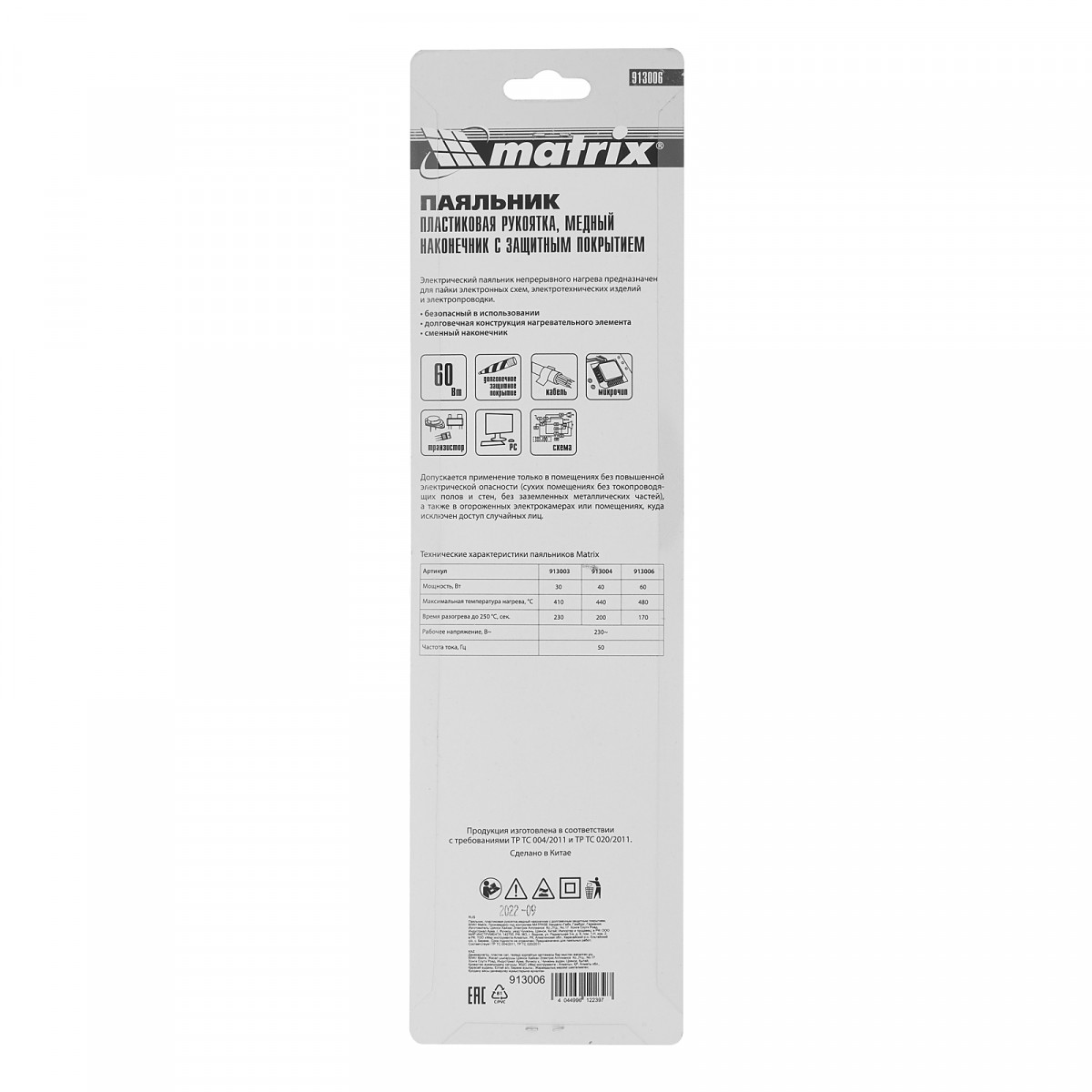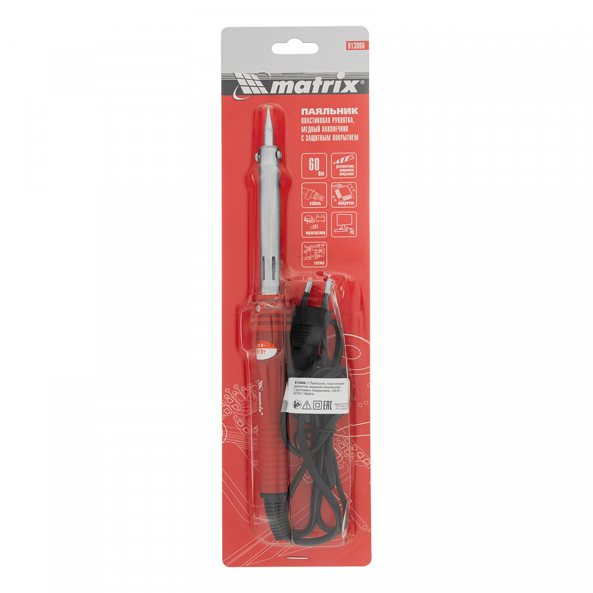 Паяльник, пластиковая рукоятка, медный наконечник с долговечным защитным покрытием, 220 В, 60 W Matrix