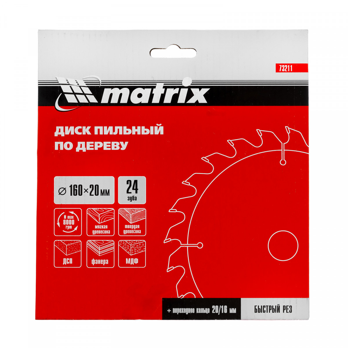 Пильный диск по дереву Matrix 73211 диаметром 160 х 20 мм, с 24 зубьями и переходным кольцом 20/16, — оснастка для циркулярных и торцовочных пил с соответствующим посадочным и внешним диаметром. Используется для продольного/поперечного реза материалов из мягкой и твердой древесины, ДСП, ДВП, фанеры, столярных плит. В комплект поставки входит переходное кольцо 20/16, позволяющее самостоятельно изменить посадочный диаметр при необходимости. Диск подходит для бытового и профессионального применения.