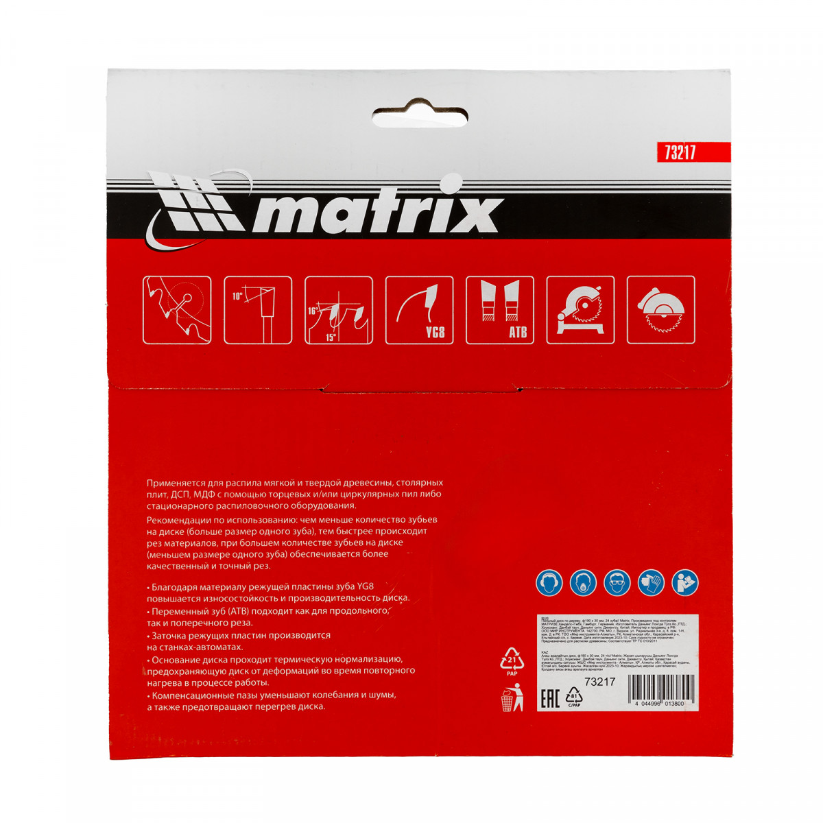 Пильный диск по дереву Matrix 73217 диаметром 190 х 30 мм, с 24 зубьями, — оснастка для циркулярных и торцовочных пил с соответствующим посадочным и внешним диаметром. Используется для продольного/поперечного реза материалов из мягкой и твердой древесины, ДСП, ДВП, фанеры, столярных плит. Диск подходит для бытового и профессионального применения.