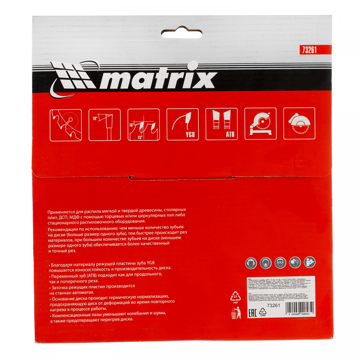 Пильный диск по дереву Matrix 73261 диаметром 200 х 32 мм, с 24 зубьями и переходным кольцом 32/30, — оснастка для циркулярных и торцовочных пил с соответствующим посадочным и внешним диаметром. Используется для продольного/поперечного реза материалов из мягкой и твердой древесины, ДСП, ДВП, фанеры, столярных плит. В комплект поставки входит переходное кольцо 32/30, позволяющее самостоятельно изменить посадочный диаметр при необходимости. Диск подходит для бытового и профессионального применения.