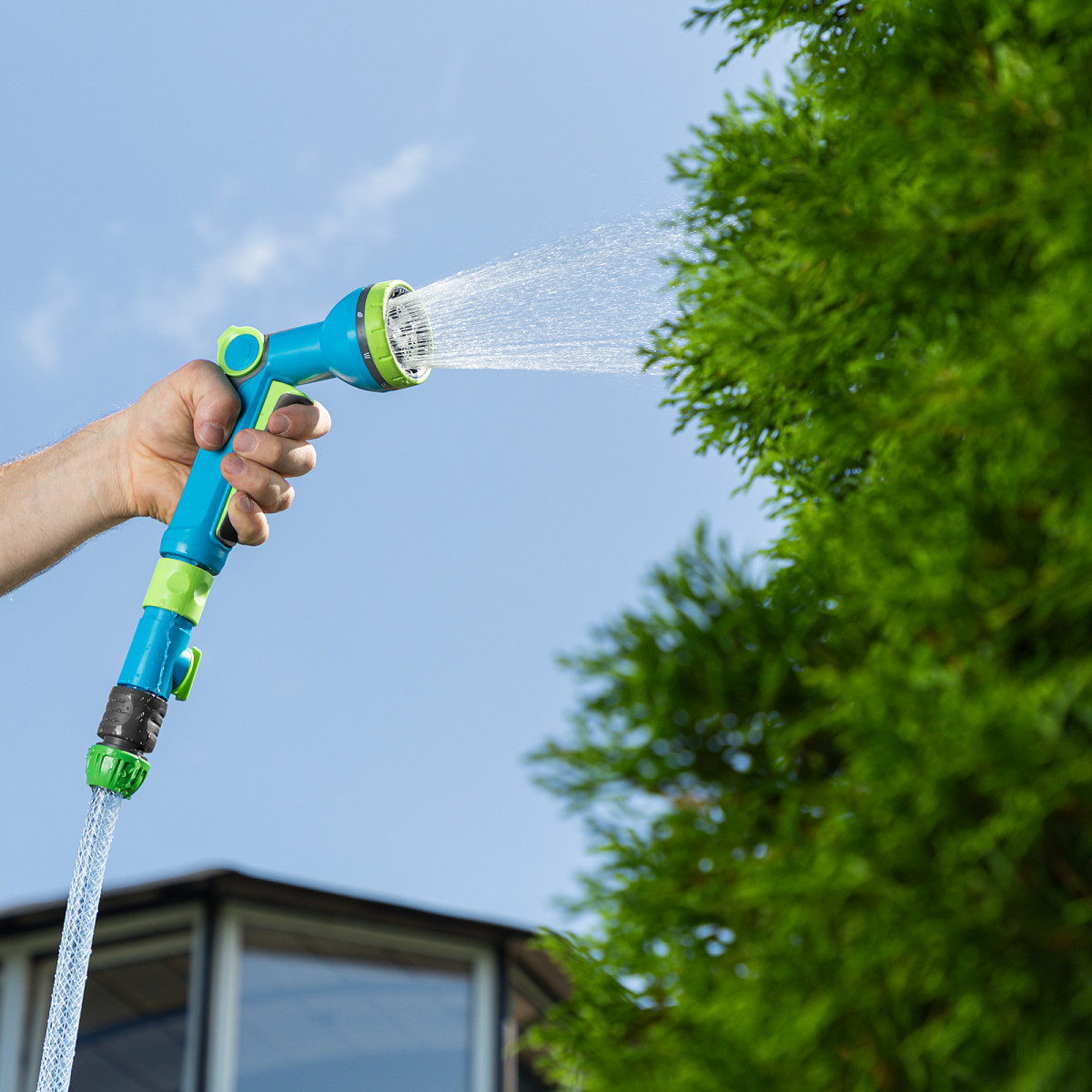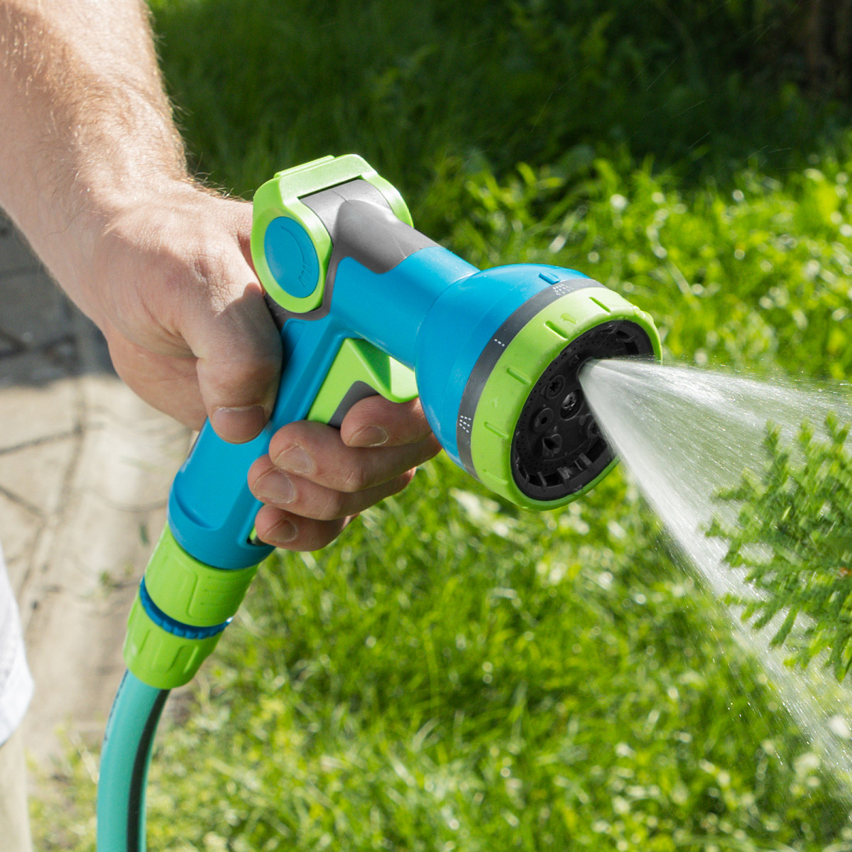 - Удобная эксплуатация — подача и отключение напора производятся при помощи курка, менять режим полива не нужно.