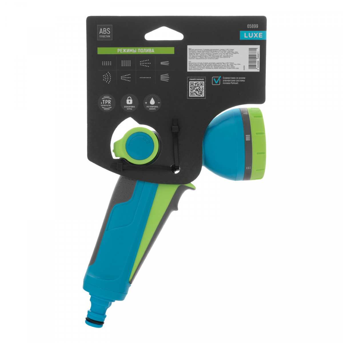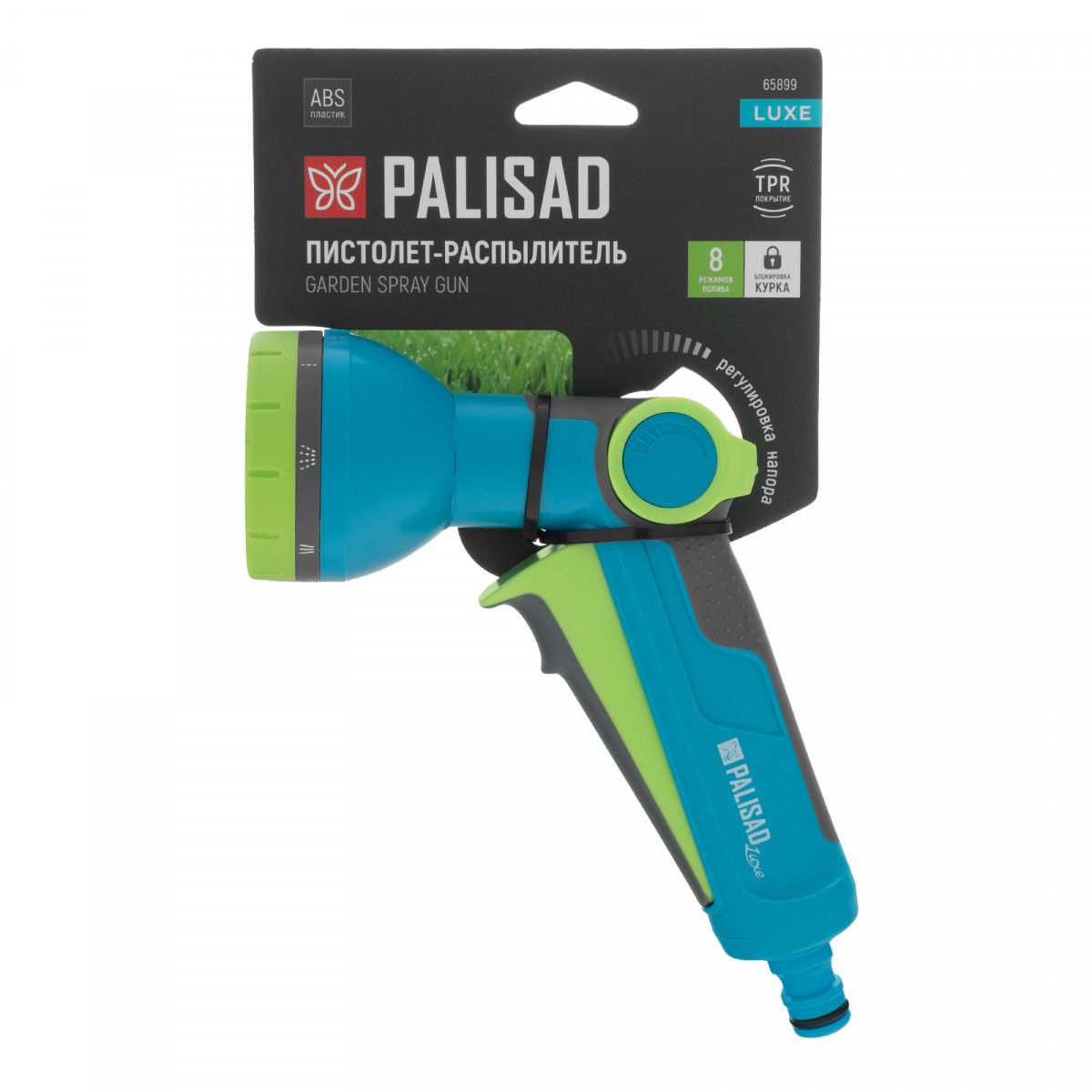 Регулируемый пистолет-распылитель Palisad LUXE 65899 с курком и 8 режимами работы подключается к любым поливочным системам ТМ Palisad и Palisad LUXE для ручного орошения растений на участке, в сквере или парке, а также для мытья дорожек и садовых принадлежностей. 8 режимов распыления позволяют выбрать необходимый тип струи для решения различных задач. Пистолет будет полезен садоводам и сотрудникам коммунальных служб.