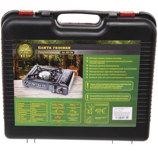 Газовая портативная плита "ТУРИСТ МАСТЕР", предназначена специально для приготовления пищи в походных условиях или на пикнике, а также очень удобна в использовании на дачном участке.Плита очень проста и удобна в использовании. В качестве топлива используется стандартный одноразовый газовый баллон или бытового газового баллона.Хранение и транспортировка осуществляется в удобном пластиковом чемодане.Технические характеристики:- Вес плиты, нетто: 1,6 кг.- Вес плиты в кейсе: 2,18 кг.- Плита газовая портативная (с переходником) работает от одноразовых баллонов 220г и от бытовых газовых баллонов 5, 12, 27,50л- Потребление газовой смеси: 118 г/час (бытовой баллон), 160 г/час (одноразовый балл)- Тепловая мощность: 1,7 кВт (1450 ккал/ч) (бытовой балл) 2,3 кВт (2000 ккал/ч) (одноразовый баллон)- Защита от неправильной установки баллона- Защита от подачи газа повышенного давления.В комплект входит: Цанга и переходник
