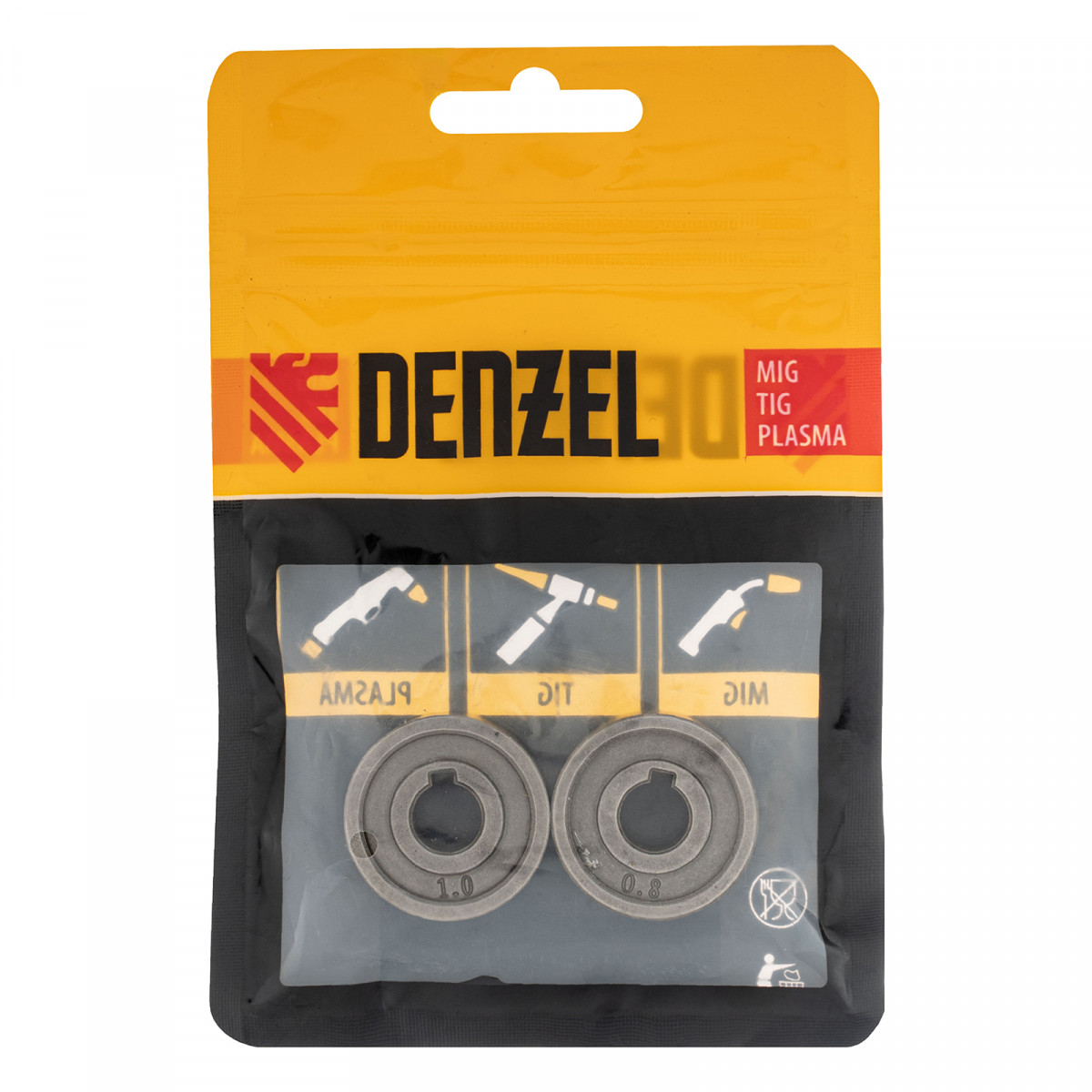 Подающий ролик Denzel 93650 с V-профилем, 2 шт. в упаковке, — элемент конструкции сварочного аппарата, предназначенный для протягивания стальной проволоки диаметром 0,8-1 мм. Совместим с моделями Denzel 94313, 94314, 94361, а также со сварочными полуавтоматами других торговых марок.