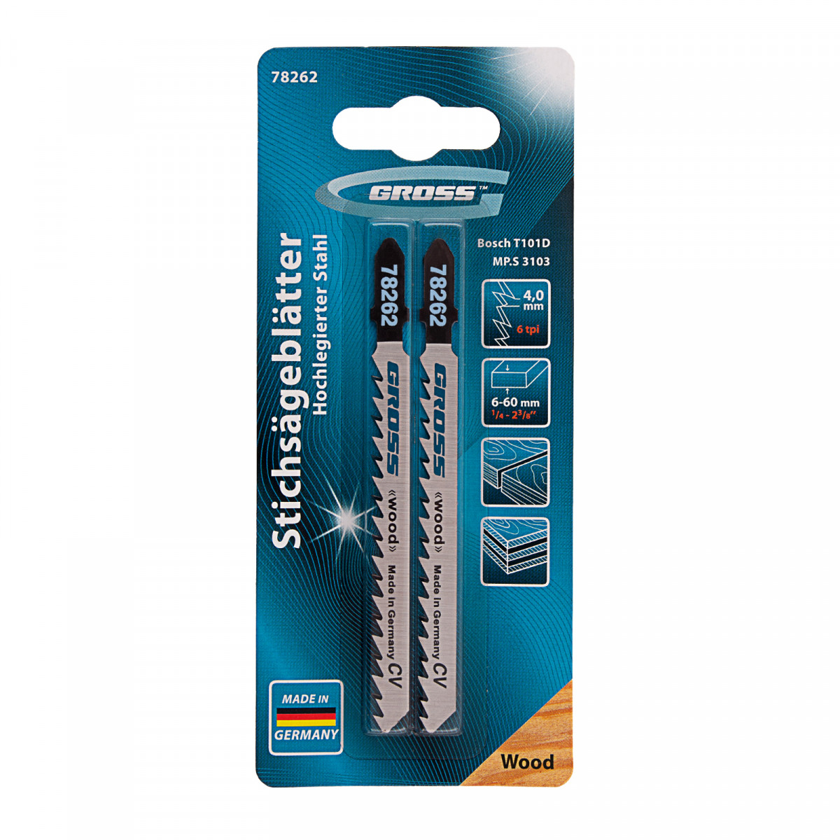 Полотна для электролобзика по дереву Gross 78262, 2 шт. (3103 - T101D), используются для работы с древесиной мягких и твердых пород, ДСП, ДВП и композитных материалов на основе древесины. Они рассчитаны на профессиональное применение, пригодятся при проведении строительных и ремонтных работ. За счет рабочей длины 75 мм и толщины 1,45 мм полотна способны распилить заготовки толщиной 6-60 мм.