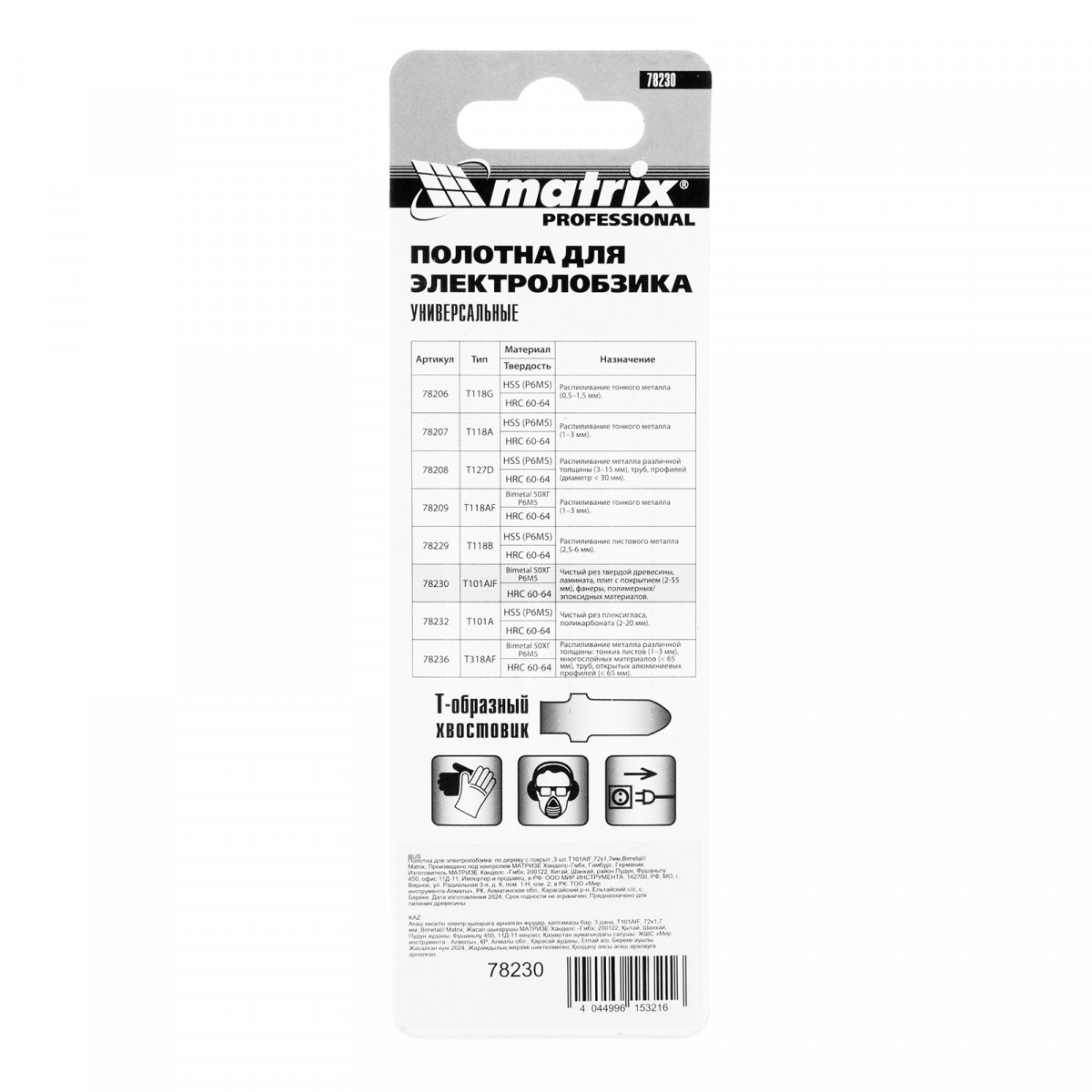 Полотна для электролобзика T101AIF Matrix 78230, биметаллические (Bimetal), с рабочей длиной 72 мм и шагом зубьев 1,7 мм, 3 шт. в упаковке, предназначены для выполнения работ по дереву толщиной 2-30 мм с покрытием, а также для распиловки ламината, полимерных и эпоксидных материалов. Имеют Т-образный хвостовик, поэтому совместимы с большинством современных электролобзиков. Пилки будут полезны во время ремонта помещений, производства и сборки мебели, а также для проведения прочих столярных работ.
