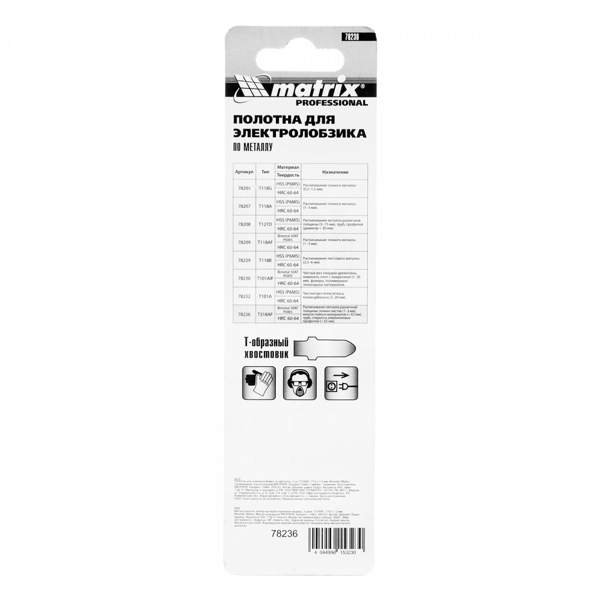 Полотна для электролобзика T318AF Matrix 78236 с рабочей длиной 110 мм и шагом зубьев 1,2 мм, биметаллические (Bimetal), 3 шт. в упаковке, предназначены для распиловки металла толщиной до 65 мм, а также труб и алюминиевых профилей. Подходят для резки цветных металлов. Пилки являются оснасткой для электролобзиков с зажимами под Т-образный хвостовик. Будут полезны при выполнении ремонтных и слесарно-монтажных работ.