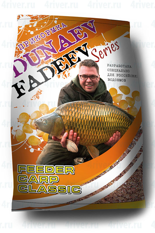 Dunaev-Fadeev Feeder Carp Classic – классическая прикормочная смесь светлого цвета для ловли карпа фидерными снастями. Особенность данной серии заключается в том, что в составе используется четыре разных вида кукурузных частиц, отличающихся по размеру и химической составляющей. Прикормка достаточно калорийная, поэтому для того, чтобы рыба как можно дольше оставалась на точке и не переедала, в нее был добавлен специальный аминокомплекс, который стимулирует пищеварение у рыб. Применять данную смесь можно как на коммерческих, так и на диких водоемах.