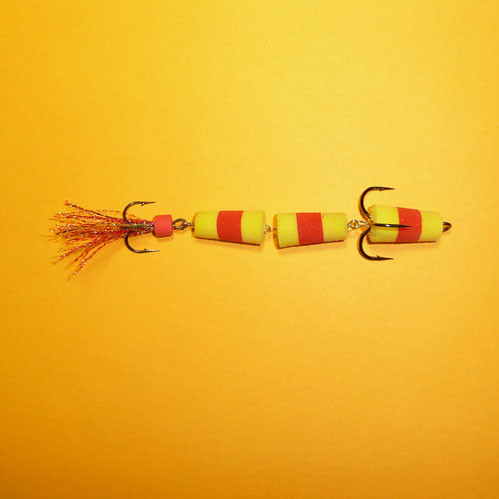 Приманка джиг. ФЛАЖОК 130 жел./крас./жел. Модель №130/2 тройника/ классика, судаковая/уп. 5шт. Модель №130 – 3-х-секционная приманка с двумя тройниками, предназначенная в первую очередь для судака, когда он предпочитает некоего «червячка». Отличается она и игрой – виляет хвостиком, что особенно заметно при медленной проводке. Практика показала, что и крупная щука также не прочь полакомиться приманкой несколько большего размера. Применяется в незакоряженных водоемах. Тройники №1/0 Kumho и №4 Sung-Woon (Корея).