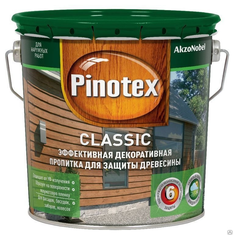 Пропитка cодержит активные добавки против плесени и синевы. Окрашенная поверхность устойчива к воздействию солнца, дождя, снега и мороза. Pinotex Classic легко наносится и быстро впитывается в поверхность древесины, образуя полуматовое покрытие. Подчеркивает естественную текстуру древесины. Для усиленной защиты глубоких слоев древесины от биокоррозии рекомендуется применять пропитку в системе с грунтовкой Pinotex Base. Возможно применение для защиты бревенчатых строений и полукруглых облицовочных профилей.