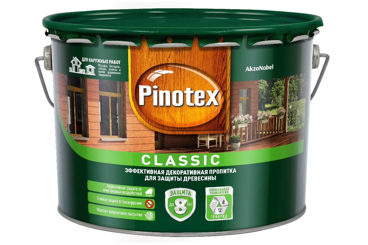 Для наружных работ. Подходит для окраски поверхностей из пиленой и строганой древесины, например, стен фасадов, беседок, садовой мебели, заборов, окон, дверей, навесов и т. п. Не рекомендуется использовать в жилых помещениях. Допускается использование пропитки для бревенчатых строений и полукруглых облицовочных профилей. При окрашивании горизонтальных поверхностей рекомендуется применять с лаком Pinotex Lacker Yacht.