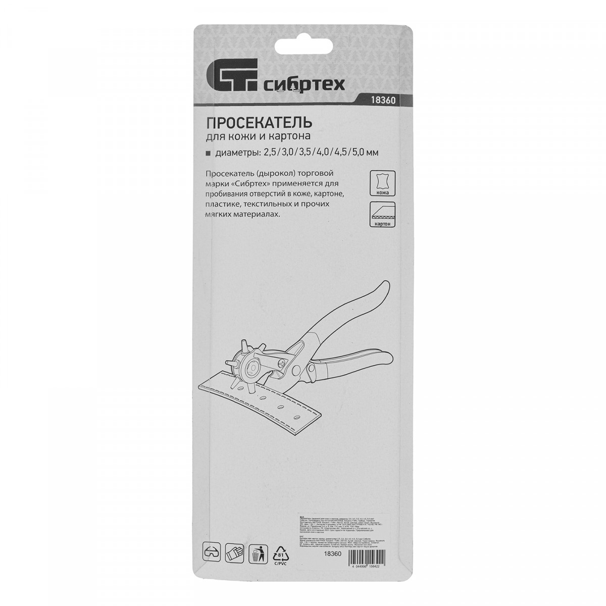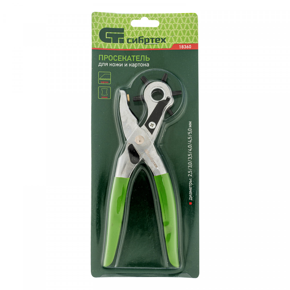 Просекатель (дырокол) для кожи и картона Сибртех 18360 позволяет проделывать отверстия различного диаметра: 2,5, 3,0, 3,5, 4,0, 4,5, 5,0 мм. С его помощью можно проколоть неплотные изделия толщиной до 3 мм. Это идеальный инструмент для работы в мастерской и дома.