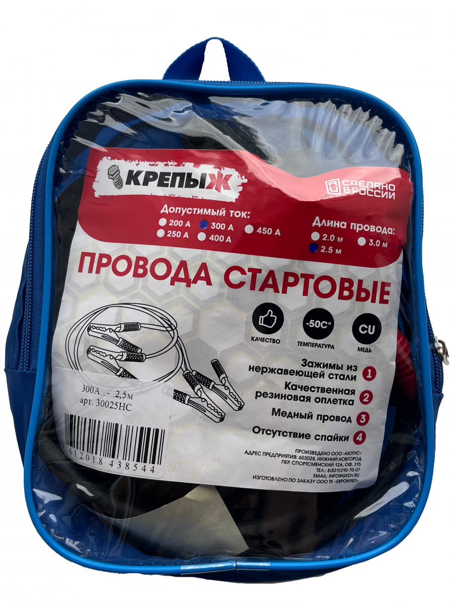 Стартовые провода КРЕПЫЖ предназначены для запуска двигателей легковых и грузовых автомобилей с разряженной аккумуляторной батареей при любых погодных условиях. Благодаря высокому качеству наши провода служат дольше, чем провода других производителей. • Морозостойкий эластичный кабель в резиновой изоляции - позволяет проводу оставаться эластичным даже в самый суровый мороз. • Медный кабель провода - медь является лучшим проводником. • Концы провода луженые - что позволяет избежать окисления и сохранить проводниковые свойства. • Крокодилы изготовлены из нержавеющей стали, благодаря которой зажимы не ржавеют в отличии крокодилов из оцинкованного металла, где со временем слой цинка становится меньше и появляется коррозия. • Соединение провода с крокодилом запрессованное - исключает отсоединение и потерю контакта. • Заявленная длинна провода рассчитана без длинны крокодилов. Дает дополнительный запас длинны и удобства в эксплуатации. • Температура эксплуатации от- 50 С до + 80 С