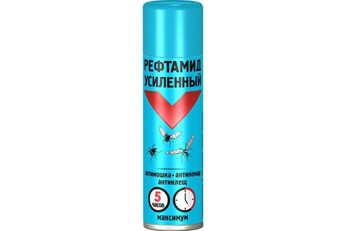 Рефтамид УСИЛЕННЫЙ Максимум — репеллентное средство для эффективной борьбы с кровососущими насекомыми. В его состав входят увеличенные количества действующих веществ, обеспечивающие более длительную (5 часов) и надёжную защиту от комаров, мокрецов, москитов, мошек, слепней, блох, а также от таёжных и лесных клещей. Состав: N,N диэтил-м-толуамид (дэта) 28%, диметилфталат 10%, бутан/пропан/ изобутан смесь 30 %, спирт этиловый денатурированный 5-15%, глицерин 5%, отдушка 5%.